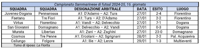 Questo il quadro completo della 16a giornata di Campionato Sammarinese di futsal: