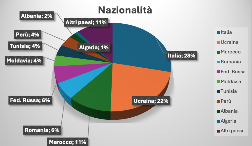 La nazionalità più comune tra gli utenti è l’italiana, che rappresenta il 28% del totale. Segue a breve distanza l’Ucraina (22%). È interessante notare la presenza di una significativa comunità proveniente da paesi dell’Africa del Nord, come il Marocco (11%).