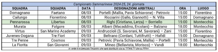 Questo il programma della 24a giornata di Campionato Sammarinese, integralmente trasmessa in diretta streaming – e in maniera totalmente gratuita – sulla piattaforma Titani.tv.