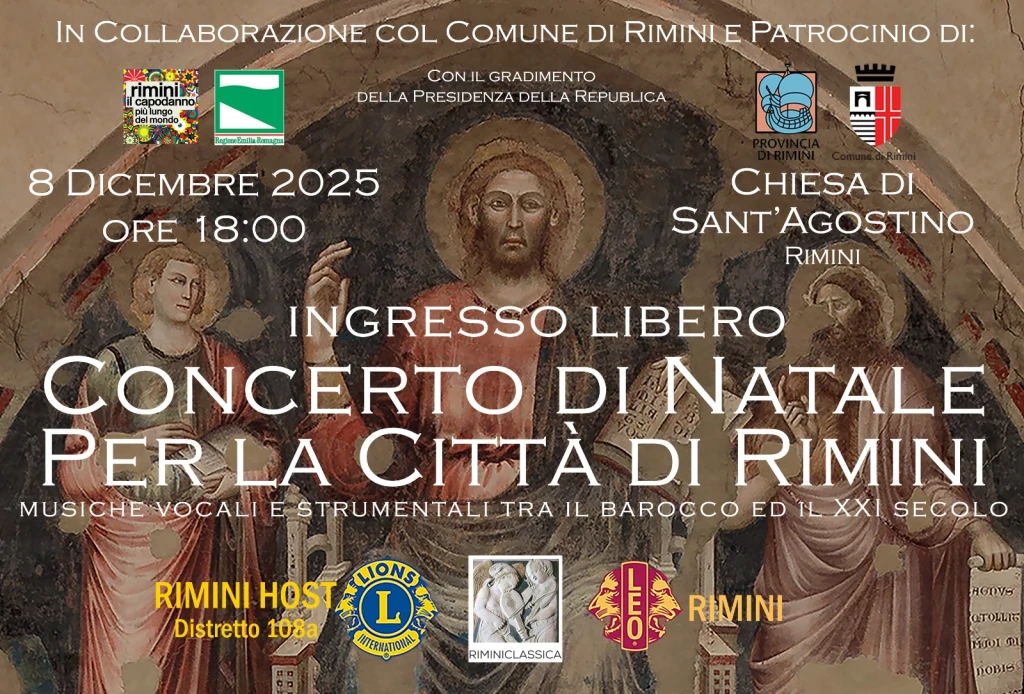 Con il patrocinio del Comune e della Provincia di Rimini, della Regione Emilia-Romagna, nonché il gradimento della Presidenza della Repubblica, il Lions Club Rimini Host celebra l’ottava edizione del “Concerto di Natale” dedicato alla “Città di Rimini”, che si terrà lunedì 8 dicembre alle ore 18 nella chiesa di Sant’Agostino (in via Cairoli, 36 - Rimini).