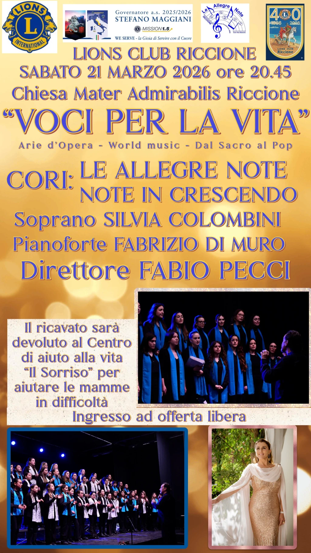 Un evento pensato per emozionare e per aiutare concretamente chi attraversa momenti difficili. Sul palco si esibiranno i cori Le Allegre Note e Note in Crescendo, accompagnati dal soprano Silvia Colombini e dal pianista Fabrizio Di Muro, sotto la direzione del maestro Fabio Pecci.