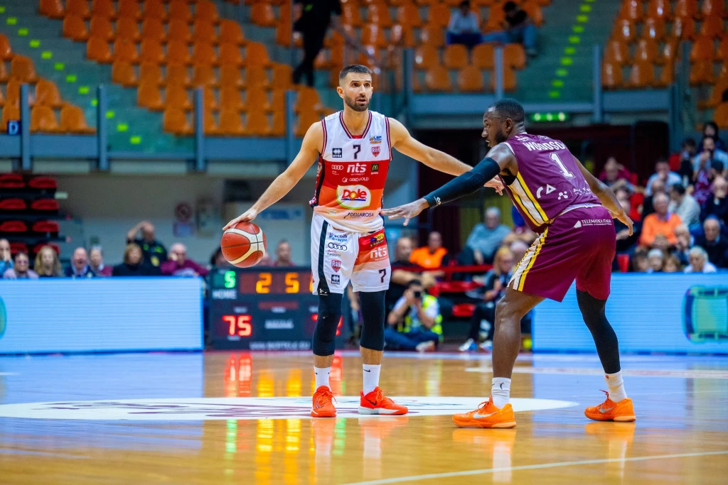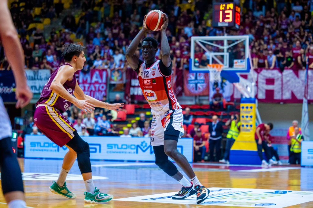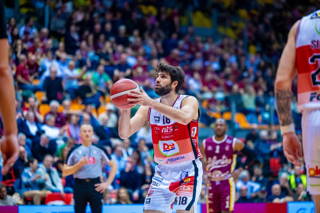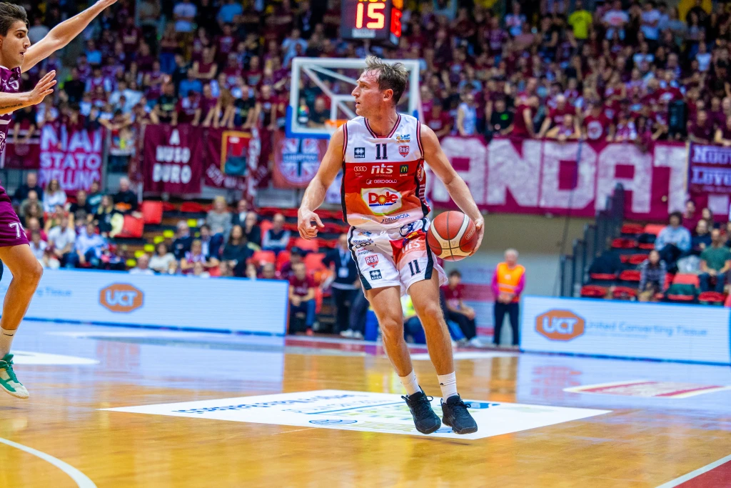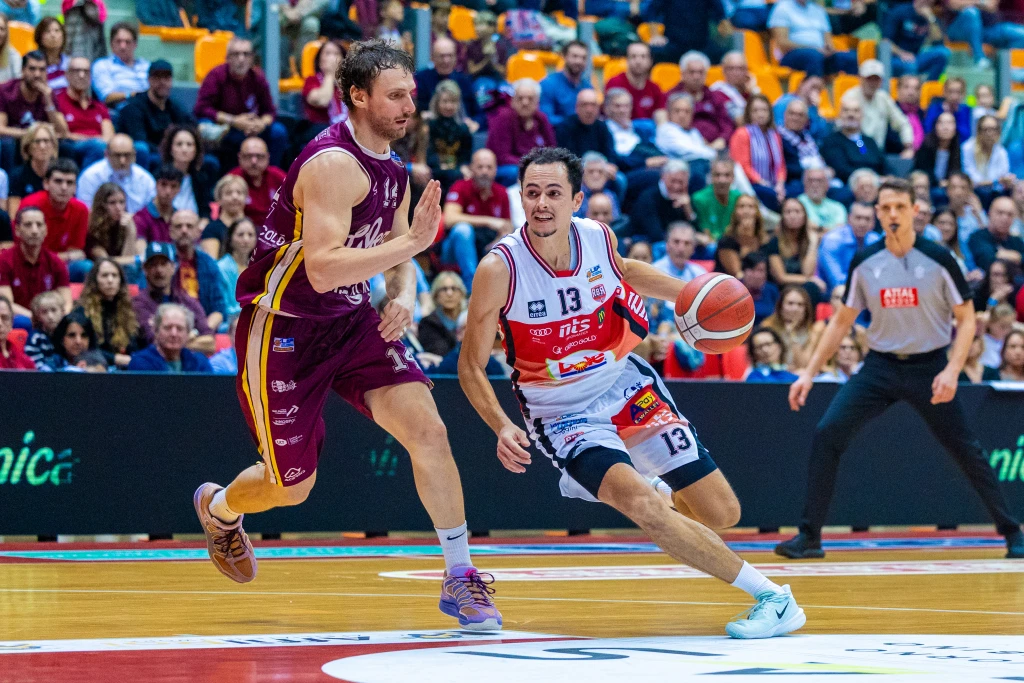 Valentini, Woodson, Piccoli, Tiby e Possamai in campo dal 1’ per la Libertas, mentre coach Dell’Agnello sceglie Denegri in regia con Marini e Pollone a completare il pacchetto esterni e Ogden e Simioni nei lunghi. Proprio Simioni e Marini da una parte, Valentini e Possamai dall’altra per i primi punti di un match che prosegue in grande equilibrio nei primi 5’; la Dole parte subito a zona, costringendo gli amaranto a tiri difficili e palle perse, e la schiacciata in contropiede di Ogden convince coach Diana a spendere il primo timeout al 6’ (8-12). Si segna pochissimo per un paio di minuti, con i soli Tiby e Marini a mantenere invariato lo scarto, poi Tomassini in lunetta e Denegri in area portano a +8 la Dole: i padroni di casa accorciano con la tripla di Woodson, poi sbagliano l’ultimo tiro del quarto e lasciano il punteggio sul 13-18.