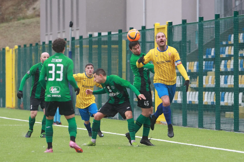 Termina senza reti il big match della decima giornata di Campionato Sammarinese. Virtus e Tre Fiori ad Acquaviva non si fanno male e in vetta rimane tutto invariato, con Neroverdi e Gialloblù sempre al comando. In un decimo turno caratterizzato dalle evidenti precipitazioni nevose che hanno colpito la parte alta del territorio, ad Acquaviva la prima occasione è per Scappini (9’) con una girata in area che esce di poco. Insistono i campioni in carica al 19’ con un’azione sviluppata sulla sinistra ma la difesa gialloblù respinge i tentativi di Scappini e Zenoni. Il Tre Fiori aspetta e riparte, come nell’occasione della mezz’ora con la gran palla di prima di Prandelli che manda in porta Bernardi, Passaniti legge bene ed esce tempestivamente senza commettere fallo. Si passa alla ripresa e in avvio una chance per parte: il colpo di testa di Scappini è debole e non crea problemi a Nardi, sul ribaltamento di fronte Bernardi viene atterrato in area ma l’arbitro Xhafa lascia giocare sotto le proteste di tutto il popolo gialloblù. La gara rimane in equilibrio e nel finale Passaniti si deve ancora allungare sull’incornata di Prandelli poco prima del novantesimo. Nei 4’ di recupero accade poco e niente, ad Acquaviva finisce così 0-0. Secondo pareggio per entrambe le squadre nel torneo, con la Virtus che per la prima volta non riesce ad andare in gol.