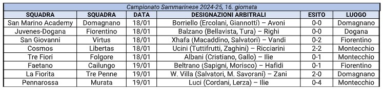 Questo il quadro completo del 16° turno di Campionato Sammarinese: