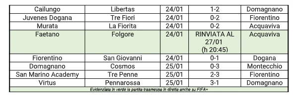 Questo il quadro aggiornato della 18° giornata di Campionato Sammarinese, che si completerà martedì sera ad Acquaviva – ore 20:45 - con il recupero di Faetano-Folgore (rinviata per nebbia).