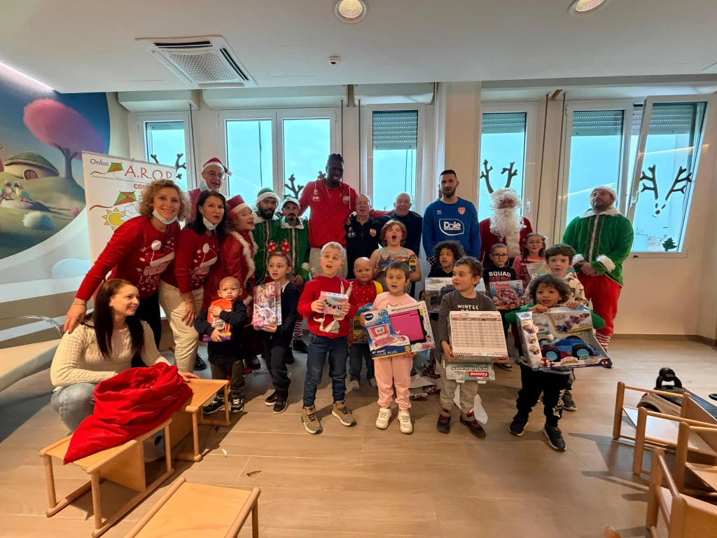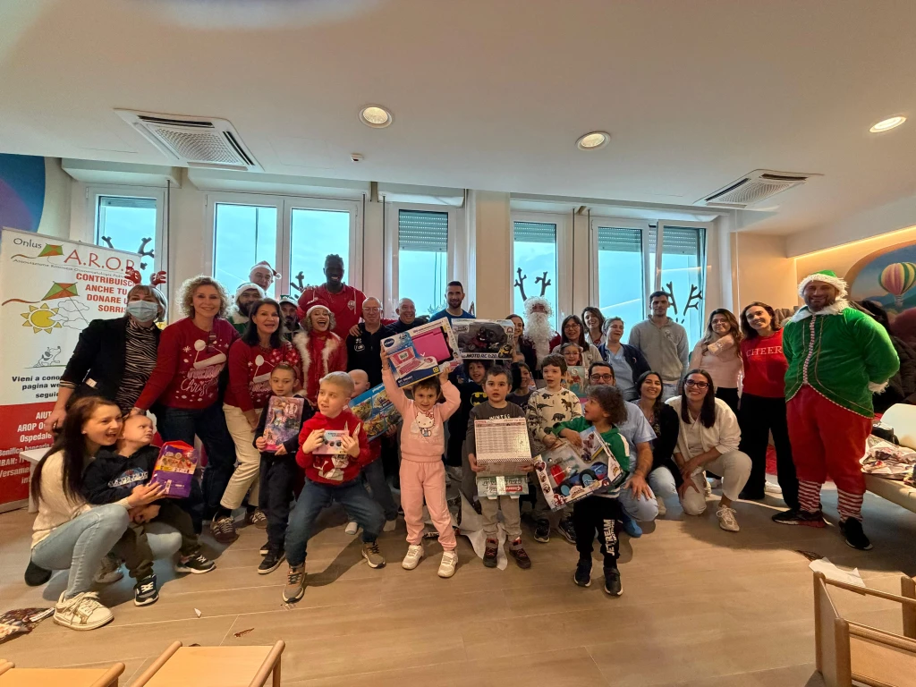 A rappresentare il club erano presenti il capitano Giovanni Tomassini, il centro Gora Camara, l’Amministratore Delegato Paolo Carasso e il team comunicazione, accompagnati dal Presidente di Arop Roberto Romagnoli, dalla responsabile marketing di Dole Italia Cristina Bambini e dai partner storici Dulca e Acrobatica. La consegna dei doni si è svolta nella sala d’attesa del reparto, trasformata per l’occasione in un luogo di sorrisi e stupore.