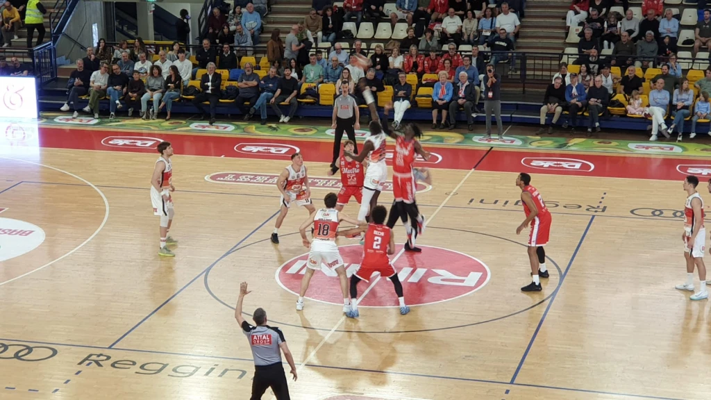 La partita. I primi due punti sono di Camara (2-0). Camara va in lunetta e fa 1/2 ai liberi: 3-0 a -8'06". Boussounka fa 1/2 dalla lunetta: 3-1. Tripla di Reggiani: 3-4 a -7'04". Alipiev dalla media: 5-4. Tripla di Denegri: 8-4. Alley-oop con due punti per Boussounka: 8-6. Tripla di Pollone: 11-6. Denegri va negli spogliatoi insieme al fisioterapista. Aromando dalla media: 11-8. Schiacciata a una mano di Camara: 13-8. Il secondo fallo di Camara manda in lunetta Aromando, che fa 1/2: 13-9. Canestro dalla media di Saccoccia sul suono dei 24": 15-9. Aromando da due: 15-11. Alipiev segna e subisce fallo: 17-11 a -3'16". Time out Mestre prima dell'aggiuntivo, che poi Alipiev sbaglia. Saccoccia segna e subisce fallo: 20-11 (+9 RBR) a -2'36". Pallone schiacciato di Saccoccia per due punti facili di Simioni e Rimini doppia Mestre (dopo un parziale di 7-0): 22-11. Canestro da due di Knight: 22-13. Ultimo minuto. Tripla frontale di Stewart (5-0 Gemini): 22-16 al 10'.