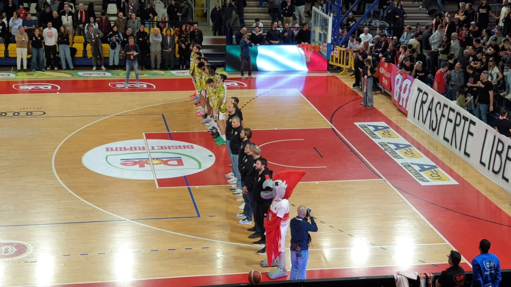 La partita. I primi due punti sono di Bruttini (0-2). Ogden va in lunetta e fa 1/2: 1-2 a -9'27". Tripla di Teague (1-5). Rimbalzo offensivo di Camara dopo la tripla sbagliata da Ogden e due punti da sotto: 3-5. Due punti su rimessa di Teague: 3-7. Allen fa 2/2 ai liberi: 3-9 a -7'40". Marini dall'arco: 6-9. Canestro di Teague, che subisce anche fallo da Pollone (il secondo a livello personale): 6-11 a -5'56". Time out Rimini. Teague non completa l'azione da tre punti. Canestro di Marini con l'aiuto della tabella: 8-11. Teague sale a 9 realizzando a pochi secondi dai 24 a disposizione: 8-13. Denegri fa 2/2 ai liberi: 10-13 a -5'09". Allen fa 2/2 dalla lunetta: 10-15 a -404". Tripla di Leardini: 13-15. Spinta nella lotta a rimbalzo in attacco di Leardini, Cusin fa 1/2 dalla lunetta: 13-16. Contropiede di Rimini: assist di Tomassini per Denegri, che imbuca da tre e pareggia: 16-16. Il sorpasso biancorosso è griffato Marini, che segna e subisce fallo (il secondo di Cusin): 18-16 a -2'02". Time out Torino. Alla ripresa del gioco Marini realizza anche l'aggiuntivo (sale a 8): 19-16. Tripla di Tomassini e +6 RBR: 22-16. Allen fa 2/2 ai liberi: 22-18 a -1'04". Bel canestro di Allen, che va fino in fondo: 22-20. La preghiera di Tomassini si ferma sul ferro. 22-20 al 10'.