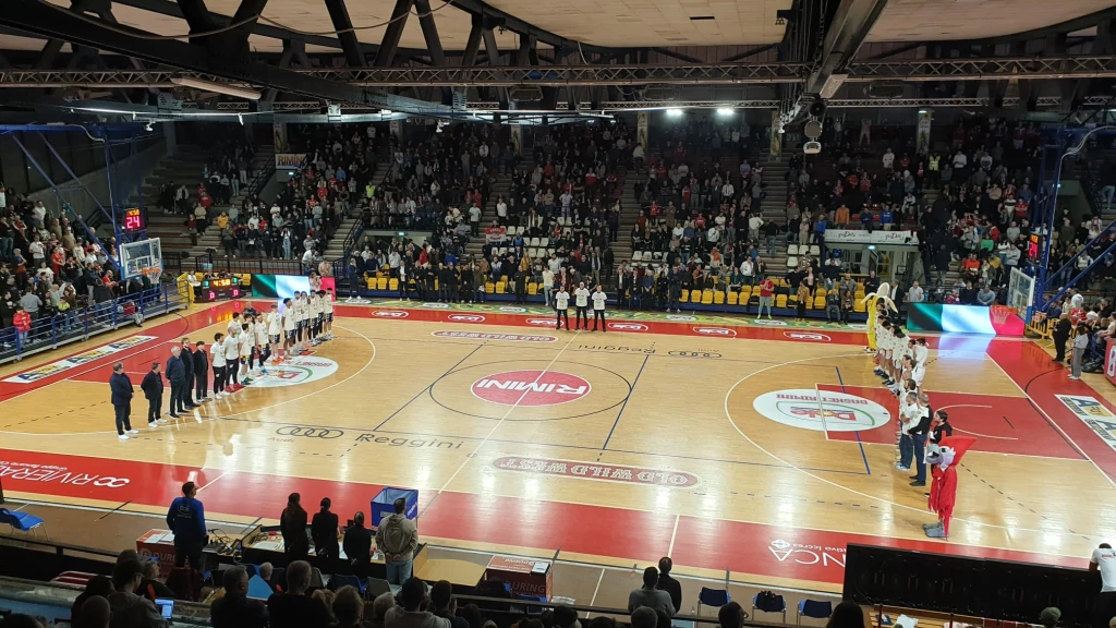 La partita. Tripla di Marini (3-0). Assist di Ogden per Camara, a segno dal pitturato: 5-0. Marangon sblocca i friulani dalla lunetta con un 1/2: 5-1 a -7'50". Ferrari da due: 5-3. Mastellari di tabella per il pareggio: 5-5 a -6'42". Ancora Mastellari a segno, questa volta dall'arco, per il sorpasso (8-0 Cividale): 5-8 a -6'26". Pollone dall'angolo: 8-8. Tripla di Marini (6-0 Rimini): 11-8. Camara stoppa Freeman. Marini manda Mastellari in lunetta, che fa 0/2. Camara fa 2/2 ai liberi: 13-8 a -3'56". Anche Marangon fa 2/2 dalla lunetta: 13-10. Ferrari fa 1/2 ai liberi: 13-11. Assist di Tomassini per Camara, che sale a 6: 15-11. Marangon vola a canestro: 15-13. Berti a segno da sotto: 15-15. Marini riporta avanti Rimini: 17-15. Maragnon dall'arco: 17-18. Sankare subisce fallo sulla sirena: dalla lunetta fa 0/2: 17-18 al 10'.