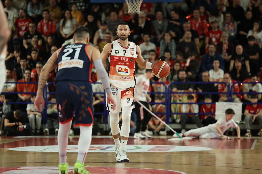 Arriva presto allo stesso bottino anche Stephens, protagonista dei primi canestri forlivesi: triple pure per Aradori e Robinson e la partita torna in parità (27-27). Ci pensano quattro punti in fila di Camara a restituire il vantaggio alla Dole, che poi va a +6 (34-28) con la tripla di Leardini: il primo timeout del match è forlivese, al 14’. Si segna poco: muovono il tabellino solo Leardini e Stephens prima di un’altra interruzione, chiamata al 19’ da coach Dell’Agnello (36-30). La Dole torna anche al massimo vantaggio (38-30) ma Forlì dimezza la distanza con due liberi di Pepe e un’acrobazia di Stephens allo scadere: 38-34 all’intervallo.