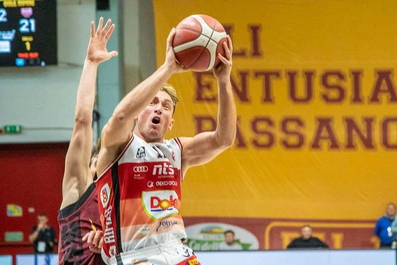 Risultato: la Dole diventa straripante. I biancorossi piazzano un parziale maxi di 17-0 con cui scappano sul +16 (24-40) e si portano a casa una buona dose di fiducia per il prosieguo. Nella cavalcata, sprazzi di Denegri, Simioni e soprattutto Marini, che va a mettere anche il punto esclamativo con la schiacciata del momentaneo massimo vantaggio. A bloccare il break riminese è Garrett (26-40), ma la Dole viaggia con il vento in poppa e trova ancora il massimo vantaggio di +18 (30-48) con la tripla dall’angolo di Pollone. A chiudere il primo tempo Garrett (32-48). Marini e Simioni vanno negli spogliatoi con 11 punti a testa.