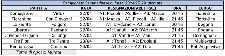 Questo il quadro parziale del 29° turno del Campionato Sammarinese di futsal: