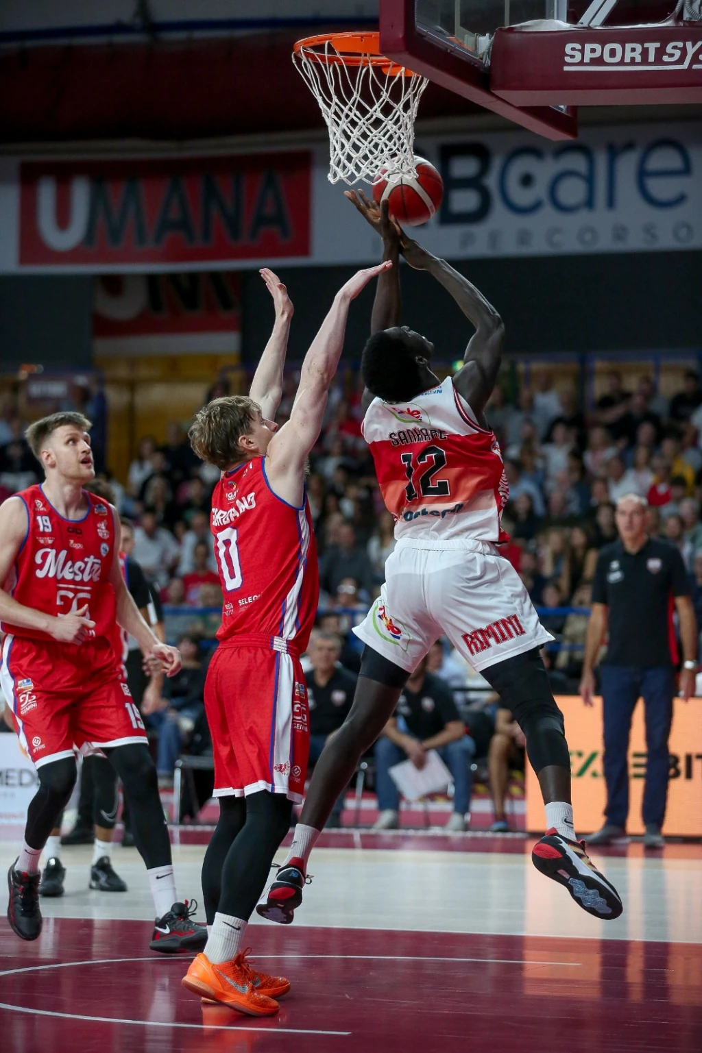 Per Mestre 7/18 da due, 5/11 dall'arco e 4/6 ai liberi. Per Rimini 13/22 da due, 5/11 da tre e 9/12 dalla lunetta. 22-11 a rimbalzo per RBR.