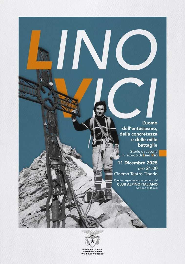 Il Club Alpino Italiano Sezione di Rimini giovedì 11 dicembre 2025 alle ore 21 presso il cinema Tiberio organizza una serata di storie e ricordi in memoria di Lino Vici.