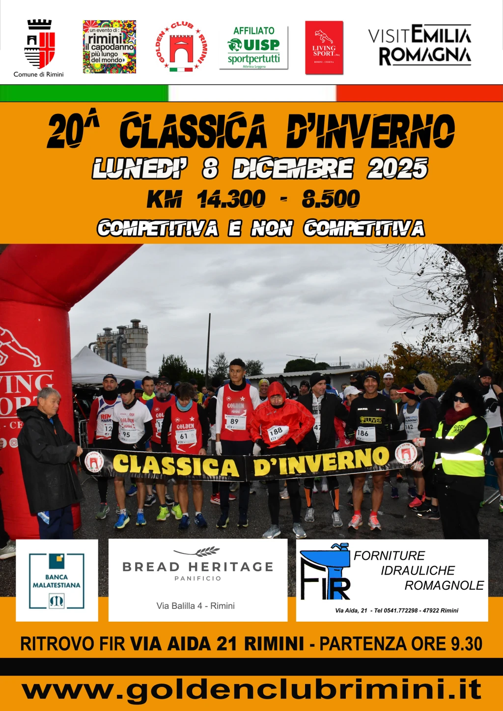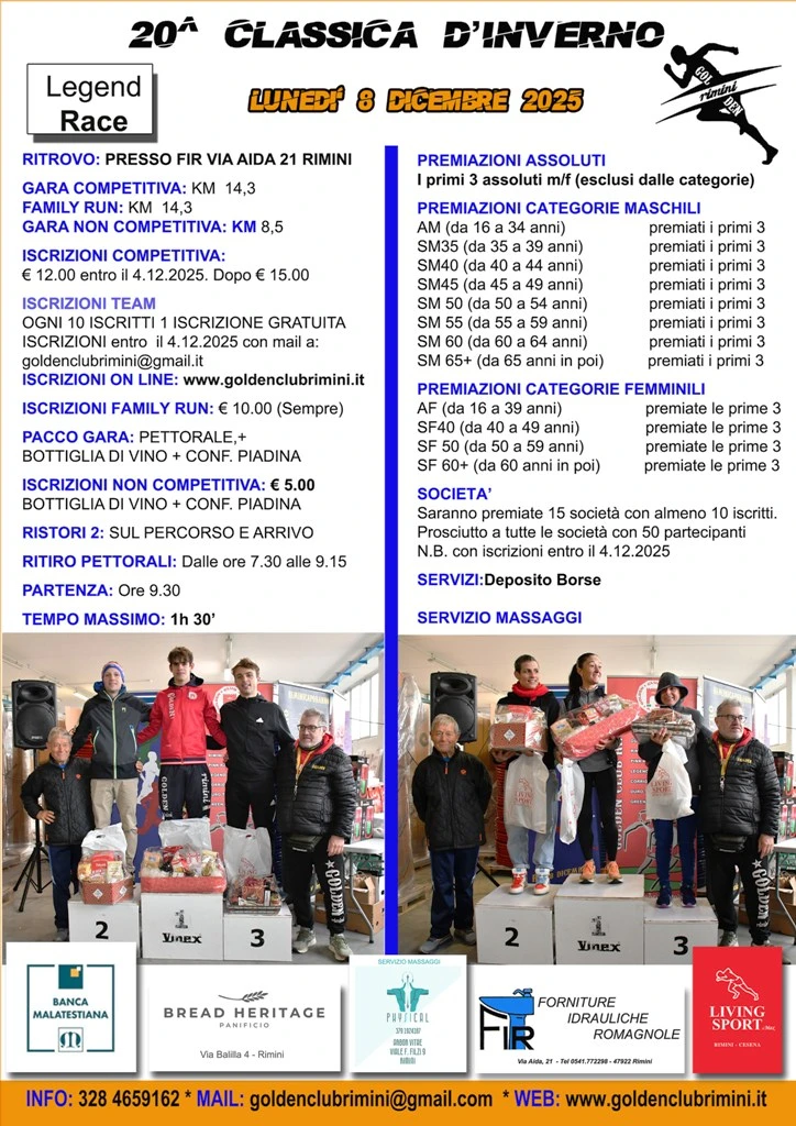 Lunedì 8 dicembre andrà in scena la 20a Classica d’Inverno “Legend Race” che si correrà sulla distanza di 14,3 e km 8,5. La manifestazione, fa parte degli eventi del Rimini Capodanno, si svolge sotto l’egida della Uisp e gode del patrocinio del Comune di Rimini.