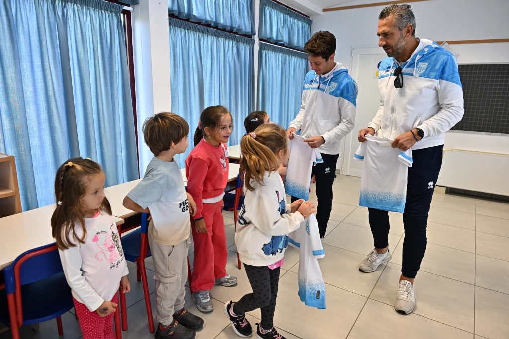 Si rinnova il progetto che vuole alimentare la passione per il calcio ed in particolare per la Nazionale di San Marino dei tifosi e giocatori di domani. In mattinata il Commissario Tecnico Roberto Cevoli ed il centrocampista Matteo Valli Casadei sono stati in visita al plesso scolastico “Il Torrente” di Dogana – incontrando bambine e bambini da poco inseritisi nel mondo della scuola.