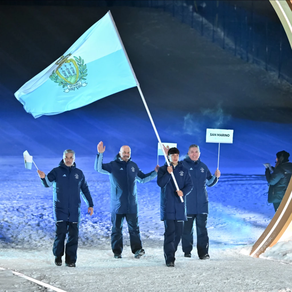 La Repubblica di San Marino si è mostrata al mondo con la bandiera biancazzurra da Livigno nella cerimonia di apertura della 25ª edizione delle Olimpiadi Invernali di Milano-Cortina 2026, in cui hanno sfilato il diciassettenne Rafael Mini, che gareggerà nello slalom gigante e speciale a Bormio