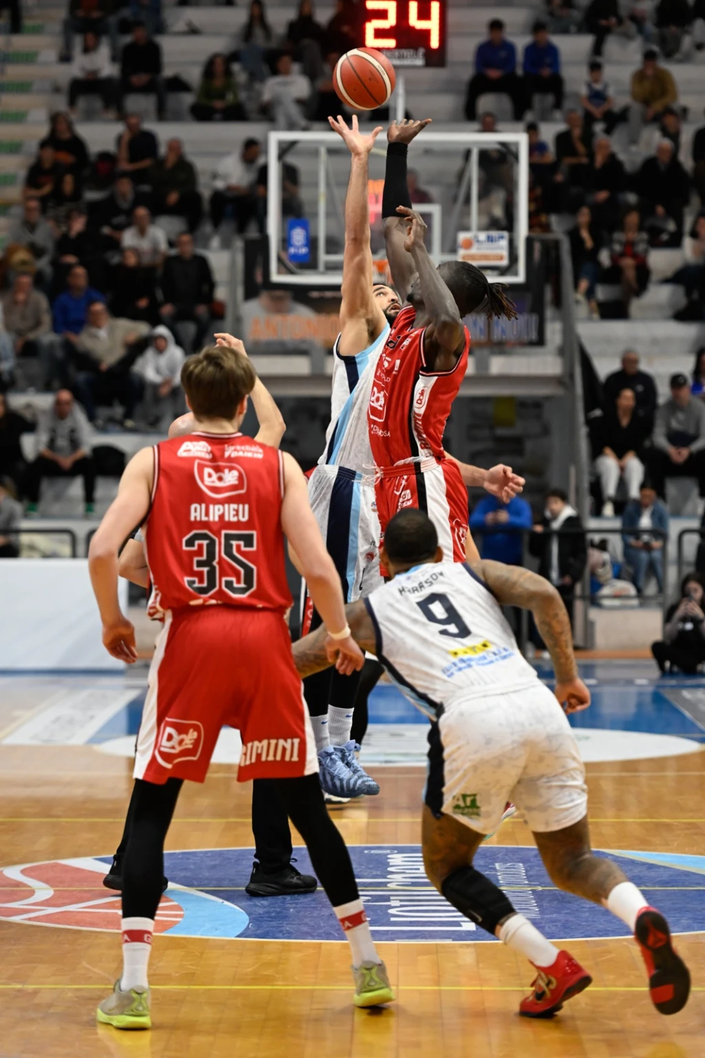 La partita. Cannon fa 2/2 ai liberi (2-0). Pollone colpisce dall'arco (2-3). Laquintana da due: 4-3. Harrison segna e subisce fallo: 7-3 dopo il +1, a -7'55". Altri due punti di Harrison: 9-3. Cannon torna in lunetta, questa volta fa 1/2: 10-3. Entrata di Saccoccia: 10-5. Harrison colpisce dall'arco (è già a quota 9): 13-5 a -6'07". Time out Rimini. Alipiev da due: 13-7. Harrison fa 2/2 ai liberi (ed è già in doppia cifra, a 11): 15-7 a -5'47". Alpiev da tre: 15-10. Landi per Cannon, a segno da sotto: 17-10. Risponde Camara: 17-12. Stoppata in parabola discendente di Camara, due punti per Harrison, che sale a 13: 19-12. Arcobaleno e canestro di tabella di Laquintana: 21-12. Tripla di Simioni: 21-15. Landi punisce la zona riminese con una tripla che porta i suoi avanti di nove: 24-15. Rimbalzo e due punti per Sankare: 24-17. Correzione di Cannon: 26-17. Seconda tripla di Simioni: 26-20. Cannon a segno ancora da sotto (sale a 9): 28-20. Harrison fa 2/2 dalla lunetta (è già a 14) e Roseto vola sul +10: 30-20. Sankare da due: 30-22. L'ultimo tiro di Harrison non va.