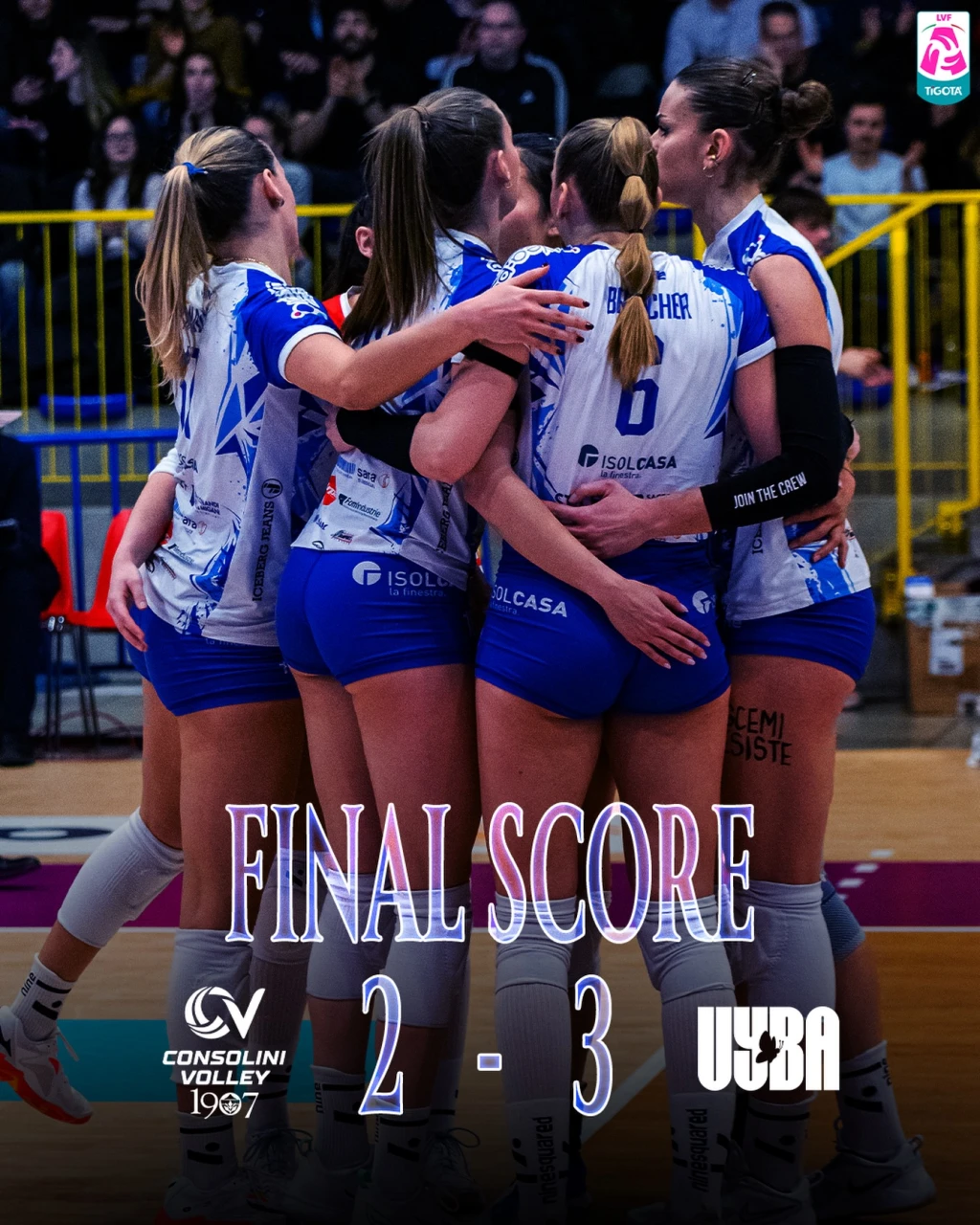 EUROTEK LAICA UYBA: Eckl 2, Seki 3, Parra 14, Torcolacci 7, Obossa 31, Battista 20, Pelloni (L), Diouf 2, Booth 1, Schmit, Boldini (L), Metwally, Parlangeli, Gennari. All. Barbolini.