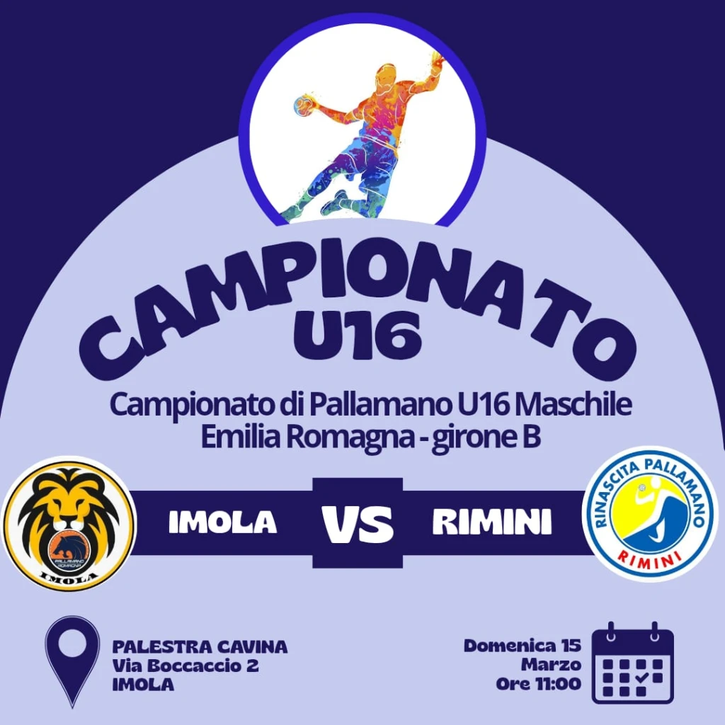 Altro impegno in trasferta per i ragazzi Under 16 della Rinascita Pallamano Rimini, che saranno impegnati domani (domenica) alle 11:00 contro Imola; partita sulla carta proibitiva vista la consistenza dei locali che viaggiano in testa alla classifica ma che potrebbe essere una buona occasione per migliorare gli aspetti ancora mancanti ai ragazzi riminesi che stanno affrontando il loro primo campionato assoluto di categoria.