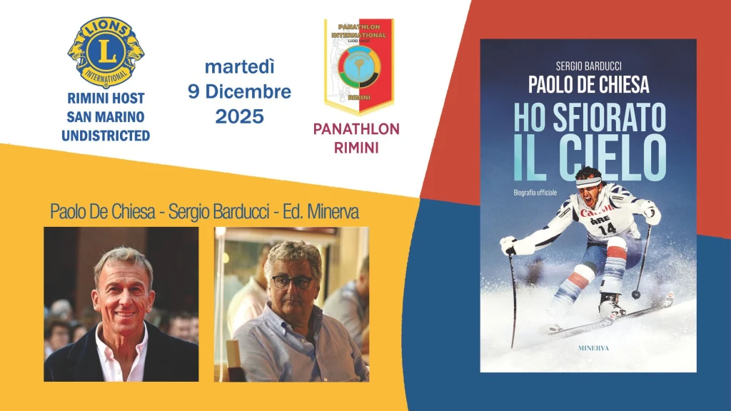 Nel cerimoniale dei saluti di prammatica, giunto al proprio momento, il Presidente del Panathlon Club Rimini, Gianluca Riguzzi, ha letto gli scopi associativi e prima della relazione del gradito ospite, il campione di sci Paolo De Chiesa, coadiuvato dal giornalista Sergio Barducci, ha approfittato della "finestra" offertagli, per illustrare brevemente ai presenti l'essenza dell'agire del Movimento Sportivo panathletico racchiuso nelle parole greche PAN ATHLON mescolate a quelle latine LUDIS IUNGIT (...nunc et sempèr).