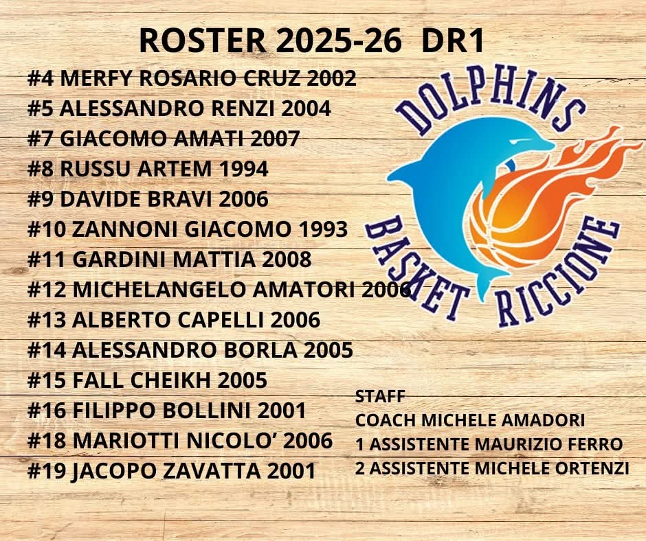 Il campionato di Divisione regionale 1 2025/2026 dei Dolphins Riccione è iniziato con una sconfitta in casa con i Giardini Margherita (74-77), ma le aspettative sono alte, con obiettivo play off, per la prima squadra del club del presidente Stefano Barosi, che ha in panchina Michele Amadori capo-allenatore e Maurizio Ferro viceallenatore, ma anche direttore tecnico e responsabile del settore giovanile.