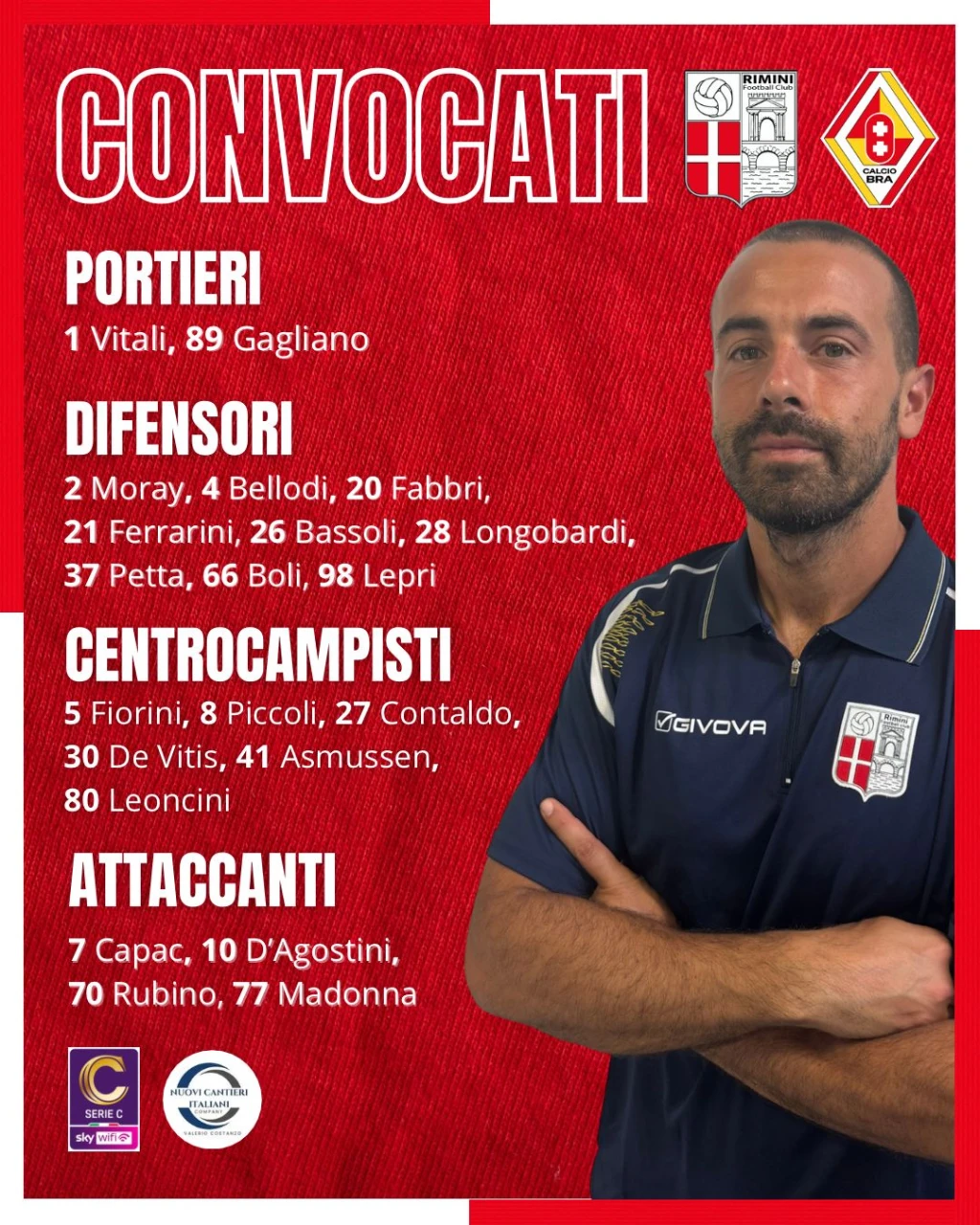 Ecco i convocati da mister Filippo D'Alesio per la partita di campionato tra Rimini e Bra, in programma domani (sabato 1 novembre) alle ore 17:30 allo stadio "Romeo Neri" di Rimini.