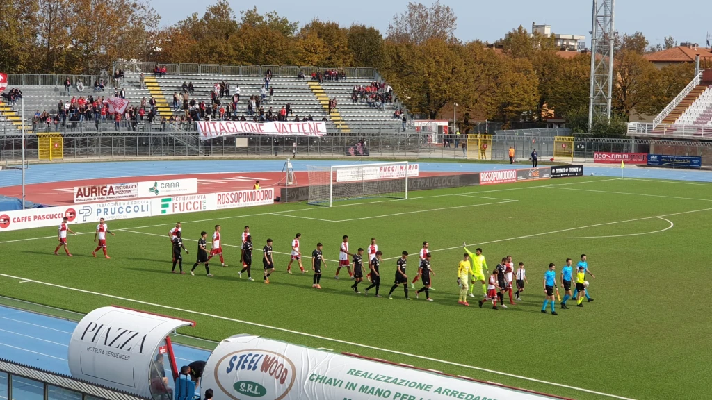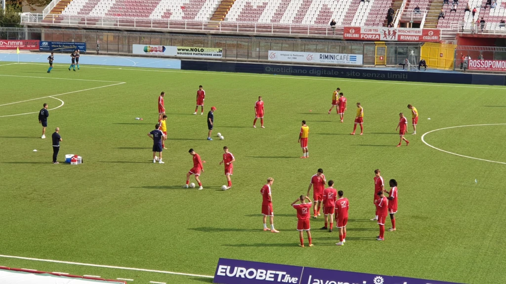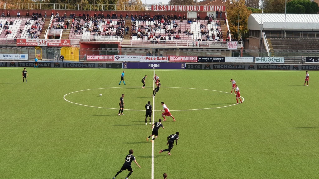 Dopo poco più di un minuto Rimini pericoloso: cross di Piccoli dall'out di sinistra, Brugarello ribatte, pallone in fallo laterale.