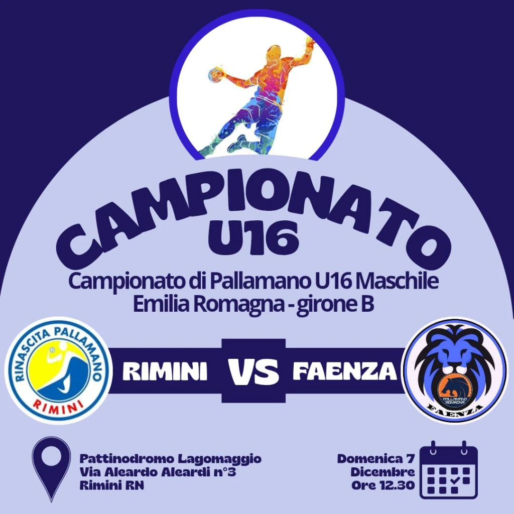 Impegno durissimo per la formazione Under 16 della Rinascita Pallamano Rimini, in campo domenica 7 dicembre alle ore 12:30 al pattinaggio Sara Brancia contro il Faenza, capolista a punteggio pieno.