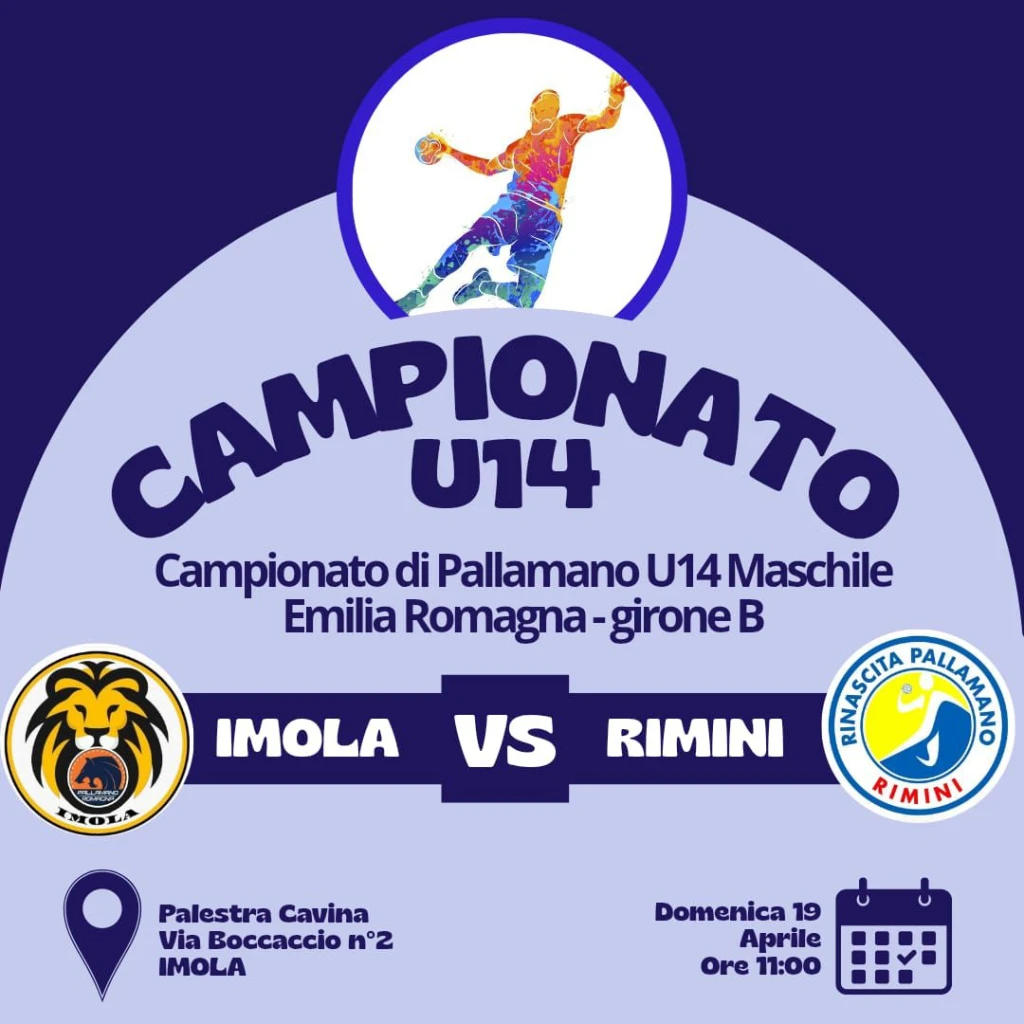 Domenica 19 aprile alle 11:00 alla palestra Cavina di Imola i ragazzi dell'Under 14 di Rinascita Pallamano Rimini, allenati da Claudio Ronchi, in questa partita senza l'aiuto Zahra Roudaki e con al suo posto Simona Domeniconi, affrontano la capolista Imola, dominatrice del girone B.
