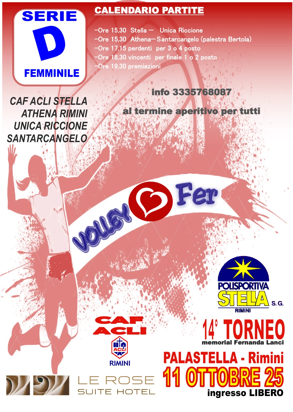 La Polisportiva Stella organizza nel pomeriggio di sabato 11 ottobre nella Palestra Stella di Via Abruzzo il Torneo Volley "Love Fer", giunto alla sua quattordicesima edizione. Il Torneo avrà inizio alle ore 15:30 con la finale prevista per le ore 18:30.
