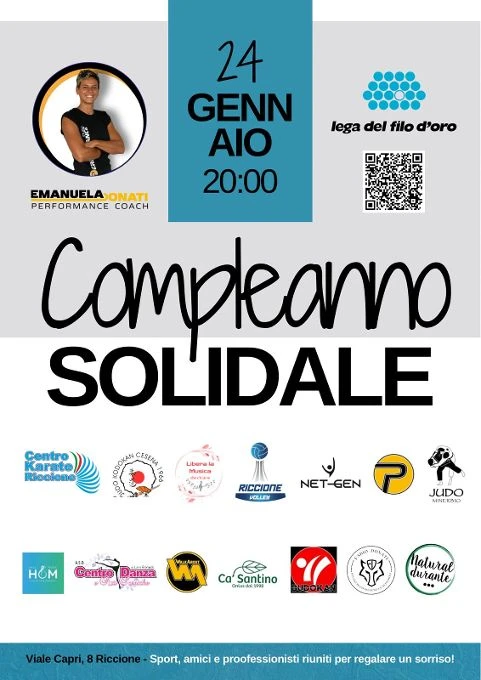 Domani sera (sabato 24) dalle 20 presso la scuola comunale di Viale Capri, 8 a Riccione si festeggerà il compleanno di Emanuela Donati, ex nuotatrice di alto livello ed ora responsabile di un centro di allenamento e preparazione, ma insieme a lei parteciperanno moltissime realtà, sportive e non solo, tutte unite per sostenere la Lega Del Filo d’Oro.