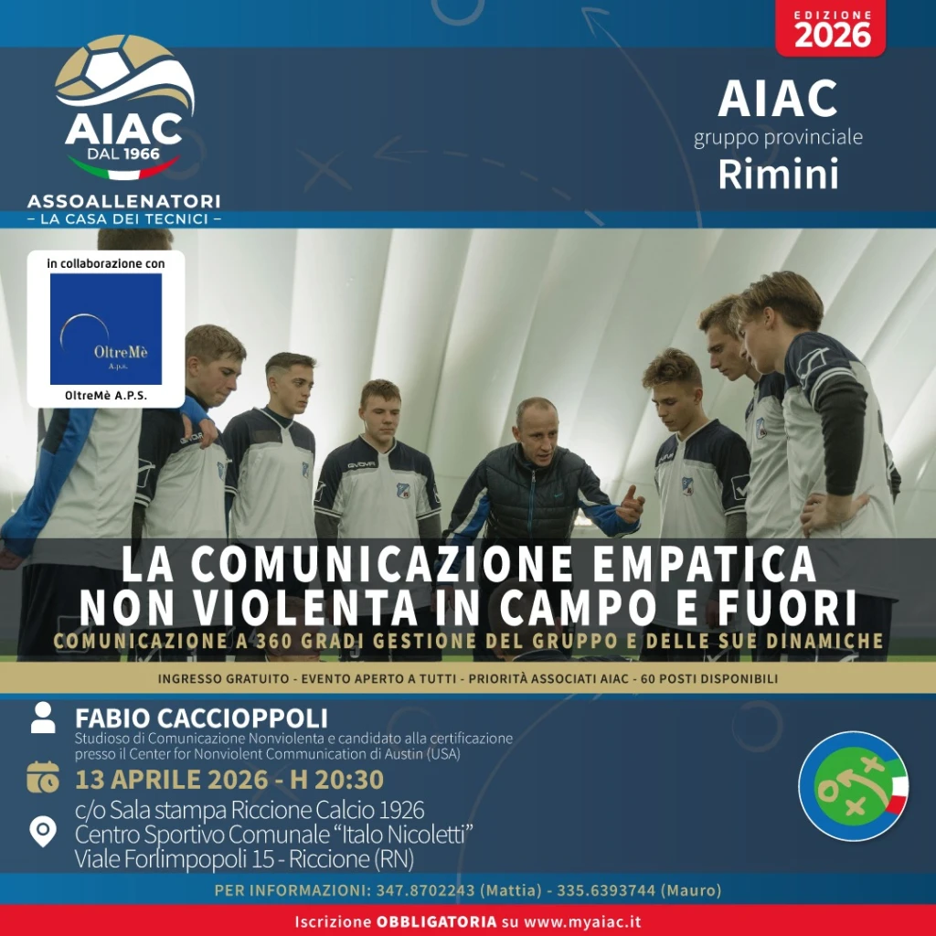 Una nuova serata formativa organizzata dall'AIAC (Associazione Italiana Allenatori Calcio) di Rimini, dal titolo: "La comunicazione empatica non violenta in campo e fuori".