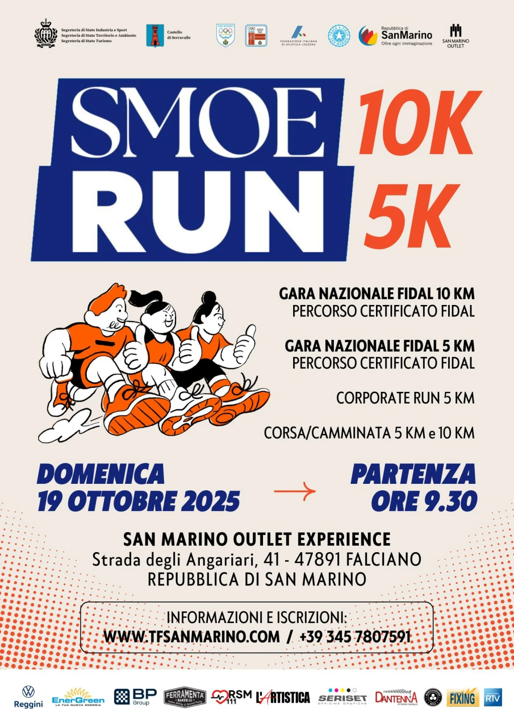 Alla quarta edizione la corsa su strada SMOE RUN di San Marino, si conferma gara di interessante livello tecnico-organizzativo, con particolare soddisfazione dei 310 partecipanti suddivisi tra parte agonistica (121) e il restante nella parte non competitiva, ma anche loro a loro scelta impegnati nei 5 o 10 km.