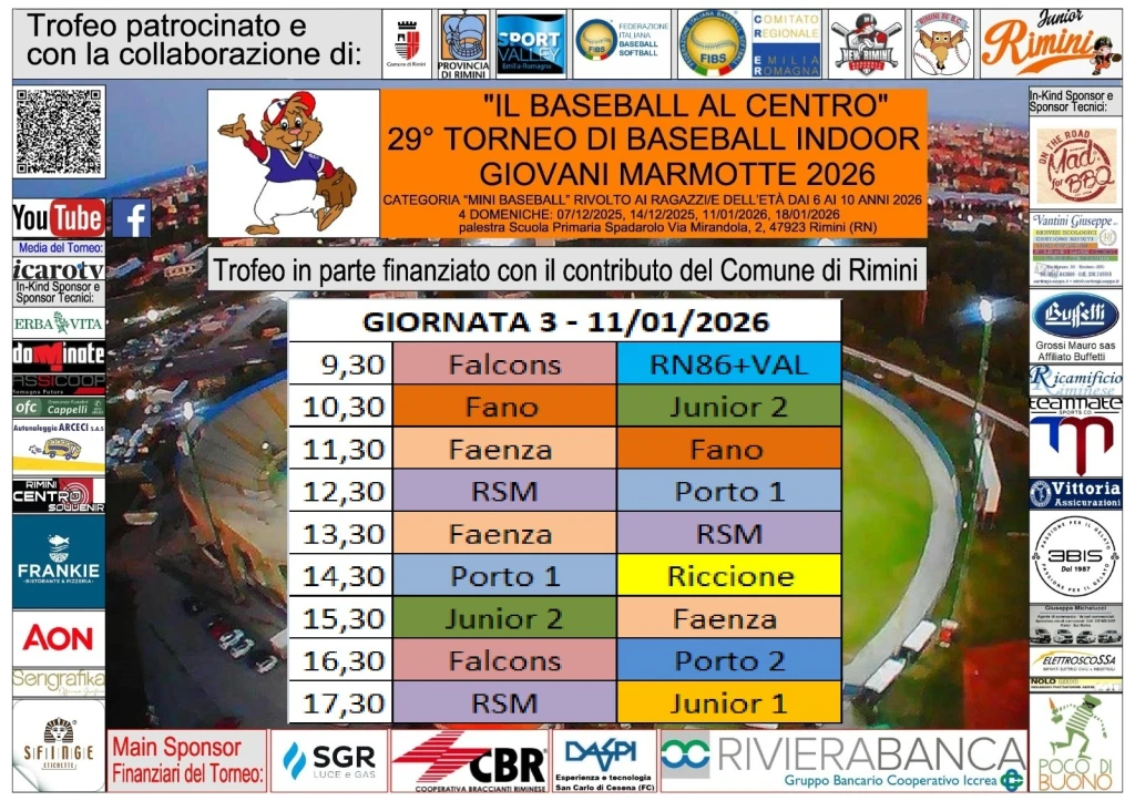 Si è conclusa domenica 11 gennaio la terza giornata de “IL BASEBALL AL CENTRO - 29° TORNEO DI BASEBALL INDOOR GIOVANI MARMOTTE 2025/26 CATEGORIA MINI BASEBALL/U10", nella palestra Scuola Primaria Spadarolo, casa invernale dell’A.S.D. Rimini '86 Baseball Club.