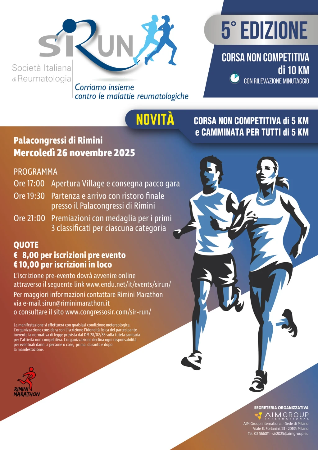 Torna, mercoledì 26 novembre, la SIRun, la corsa contro le malattie reumatologiche organizzata da Rimini Marathon e giunta alla sua quinta edizione. Ritrovo, partenza e arrivo al PalaCongressi di Rimini.
