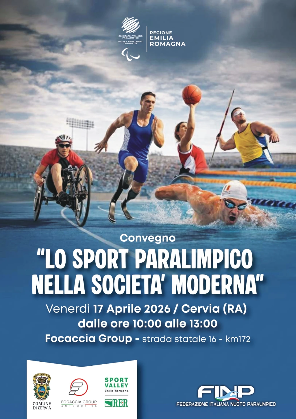Venerdì 17 aprile dalle 10 alle 13 presso la sede di Focaccia Group, strada Statale 16 n. 172, a Cervia, il CIP Emilia Romagna e la FINP, con il patrocinio della Regione Emilia-Romagna e del Comune di Cervia, hanno organizzato il convegno “Lo sport paralimpico nello sport moderno”, momento di riflessione e approfondimento sullo sport paralimpico e sul suo sviluppo nella società moderna, aperto gratuitamente a tutti e al quale sono parteciperanno molte realtà che operano da tempo con il CIP e hanno gli stessi obiettivi del Comitato Paralimpico.