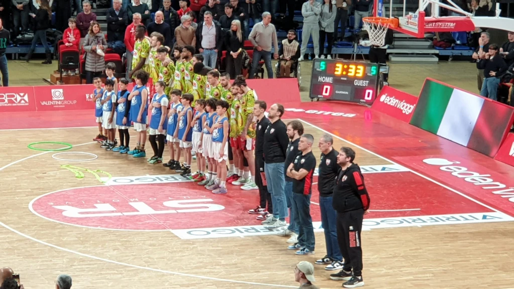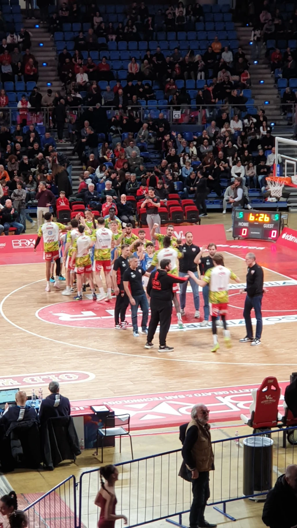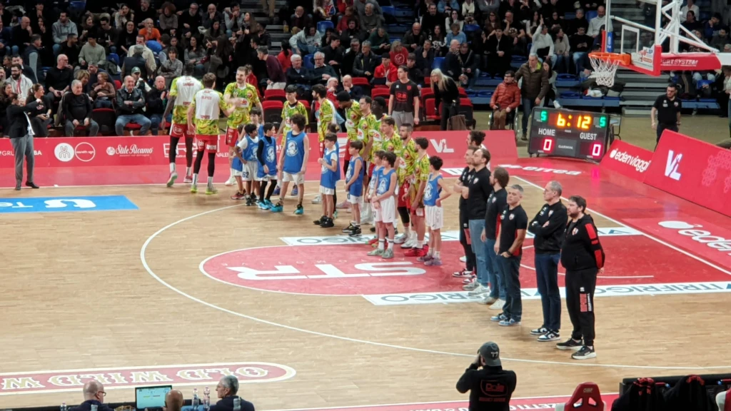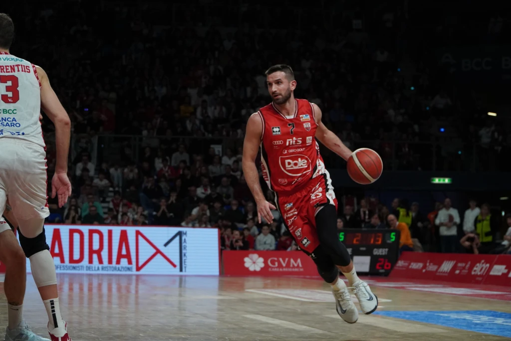 Coach Leka getta nella mischia Bucarelli, Tambone, Virginio, Maretto e Miniotas. Coach Dell’Agnello controbatte con Denegri, Marini, Leardini, Alipiev e Camara. La apre Tambone 2-0, ma Denegri risponde subito con la tripla 2-3. È la Dole che prova a osare nei primi minuti del match: dopo il 4-3 di Bucarelli, Rbr piazza un break di 10-0 e si porta sul +9 (4-13) del momentaneo massimo vantaggio. Tutti coinvolti i biancorossi con punti di Alipiev, Denegri e Marini. Sul fronte Vuelle la scossa arriva con il 3+1 a firma Virginio che vale il 9-13. Nella seconda parte della frazione Pesaro cresce, soprattutto con De Laurentiis che trova prima il 15 pari a 2’42 poi il vantaggio sul 19-17. Nel finale una tripla di Bertini vale il 22-17 del 10’.