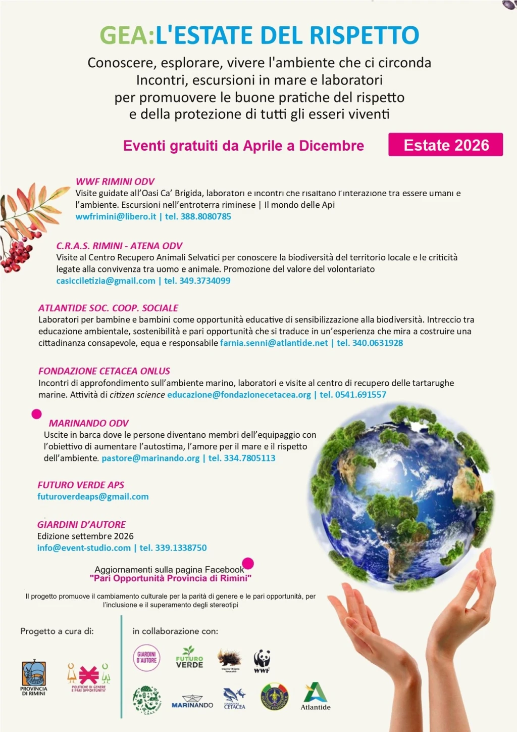 Attraverso GEA: L’estate del rispetto la Provincia di Rimini rinnova uno spazio condiviso di educazione, partecipazione e responsabilità, in cui il potere delle persone e delle comunità diventa una leva concreta per la tutela del pianeta e per la costruzione di un futuro più giusto e sostenibile e si traduca in azioni concrete, accessibili e diffuse sul territorio