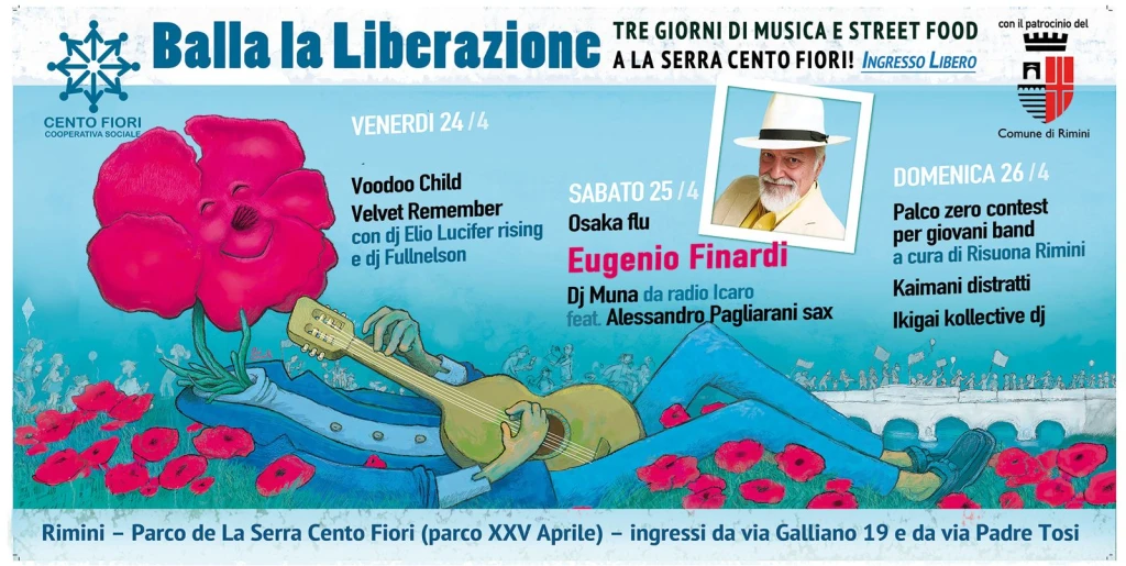 Con Eugenio Finardi come evento clou, entra nel quinto anno consecutivo Balla la Liberazione, il fine settimana in musica dal vivo e djset completamente gratuiti proposto dalla Cooperativa Sociale Cento Fiori per festeggiare degnamente il XXV aprile. E lo fa come sempre nel parco recuperato alla città de La Serra Cento Fiori, l’appezzamento di terreno e gli edifici ai bordi del polmone verde della città di Rimini, il parco XXV aprile.