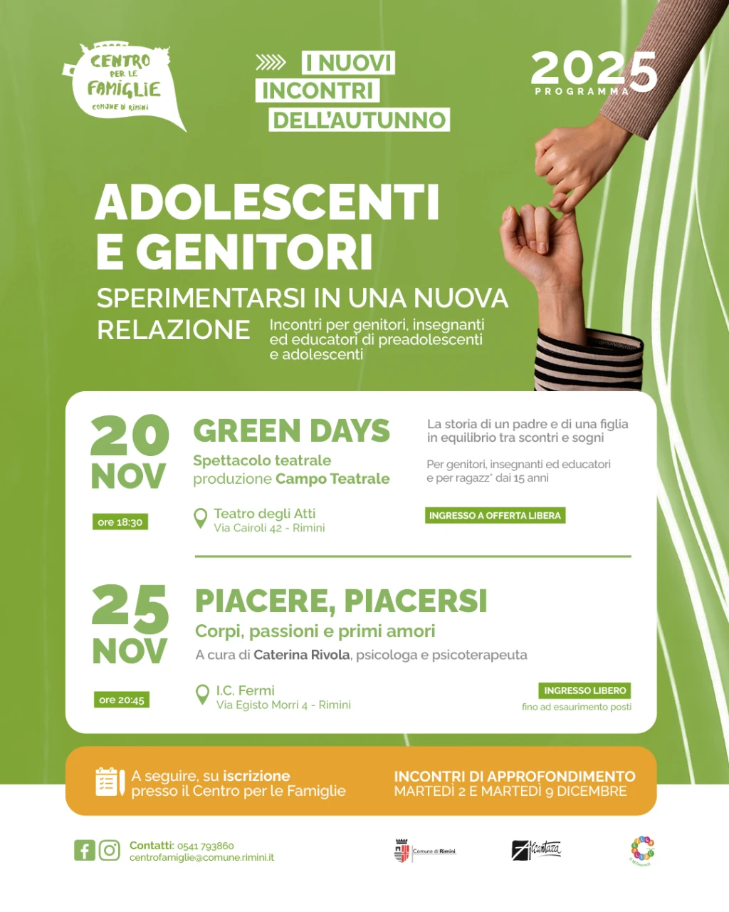 Per inaugurare il percorso, giovedì 20 novembre alle 18.30 al Teatro degli Atti si terrà lo spettacolo “Green Days”, rivolto ad adulti e a ragazze e ragazzi dai 15 anni. Un’apertura in forma teatrale, scelta proprio perché il teatro offre uno spazio “altro”: consente di toccare temi complessi passando dal corpo, dalle immagini e dall’emozione, rendendo così condivisibile e pensabile ciò che spesso è difficile nominare nel dialogo quotidiano.