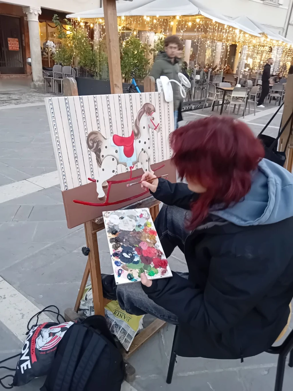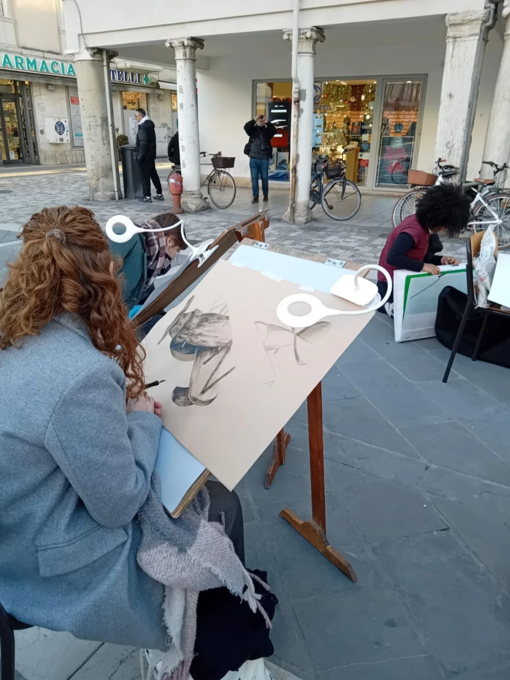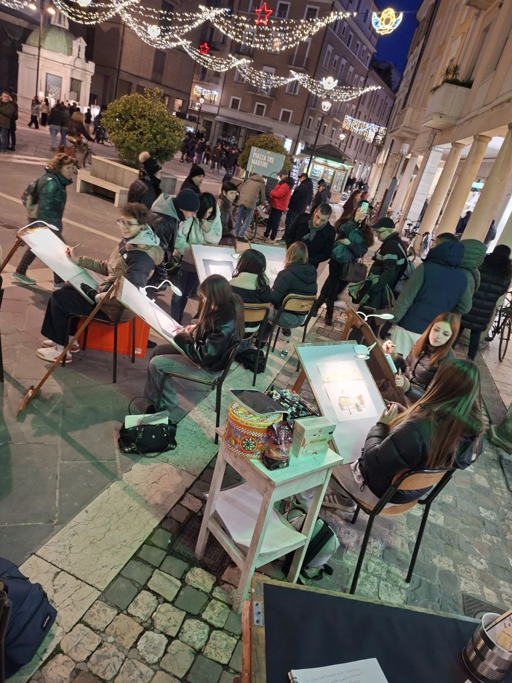 Con il calare della sera le varie postazioni ricordavano angoli di Montmatre con luci soffuse e capannelli di passanti curiosi. Tanti occhi ammirati e stupiti dalla bravura e dalla perfezione tecnica di questi artisti in formazione, che neanche le basse temperature hanno fermato.