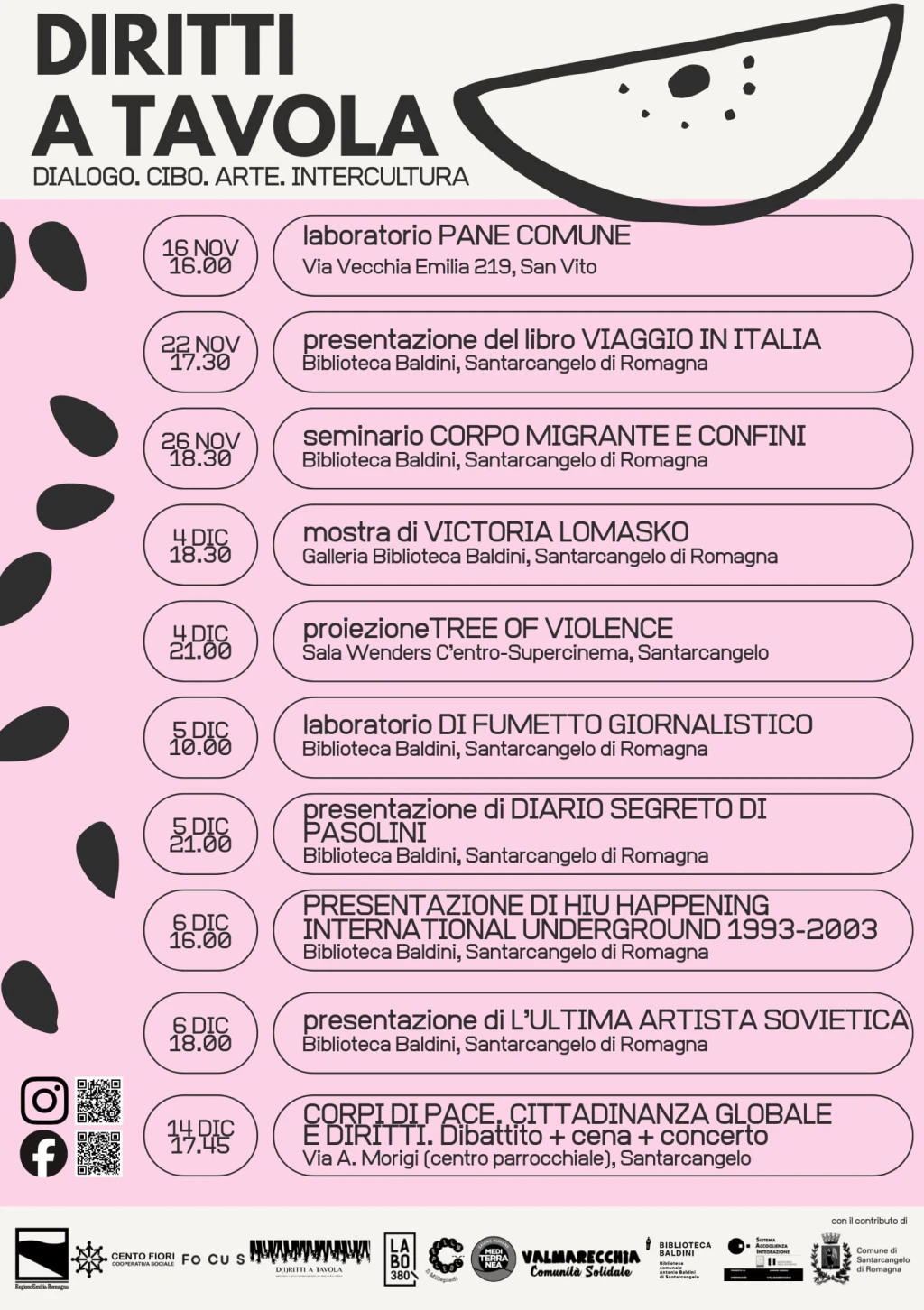 Diritti a Tavola è promosso dalla Cooperativa Sociale Cento Fiori, in collaborazione e con il contributo del Comune di Santarcangelo di Romagna, Focus, SAI Valmarecchia, Il Millepiedi Cooperativa Sociale, Scuola T. Franchini, Mediterranea Saving Humans, Labo380, Valmarecchia Comunità Solidale e Università di Modena e Reggio Emilia (UNIMORE).