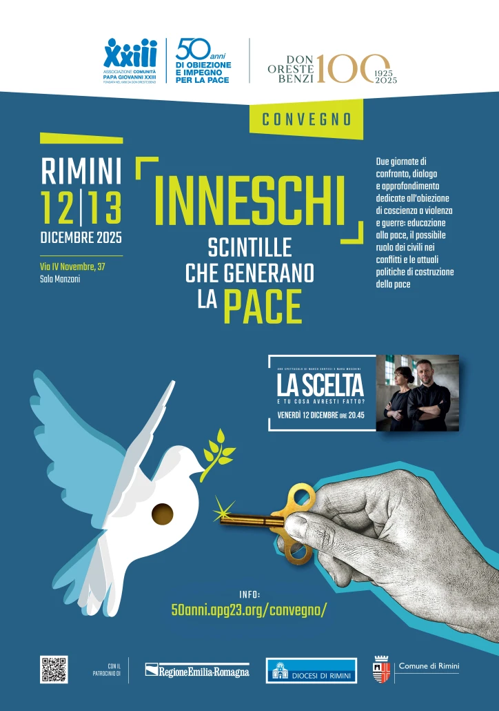 Due giorni di incontri, dialoghi e testimonianze per riflettere insieme sulla scelta e sul valore dell’obiezione di coscienza ad ogni forma di violenza, dell’impegno civile e della nonviolenza: una questione tornata di attualità a causa del contesto di tensioni internazionali, guerre e riarmo crescente, anche a fronte dell'ipotesi della ripresa della leva obbligatoria. Il convegno “Inneschi – Scintille che generano la pace” si terrà il 12-13 dicembre prossimo a Rimini, presso la Sala Manzoni.