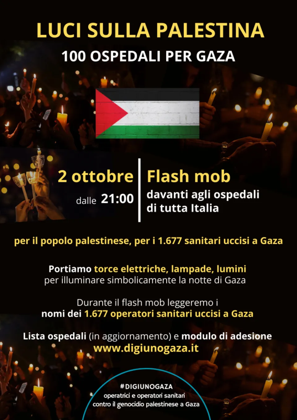 Il 2 ottobre alle 21.00 si terrà in tutta Italia l’iniziativa “Luci sulla Palestina: 100 ospedali per Gaza”, flash mob contro il genocidio palestinese a Gaza, promosso dal personale sanitario delle reti #DigiunoGaza e Sanitari per Gaza. Secondo appuntamento, dopo la Giornata nazionale di digiuno contro il genocidio palestinese del 28 agosto alla quale avevano partecipato oltre 30 mila operatrici e operatori del Servizio Sanitario.
