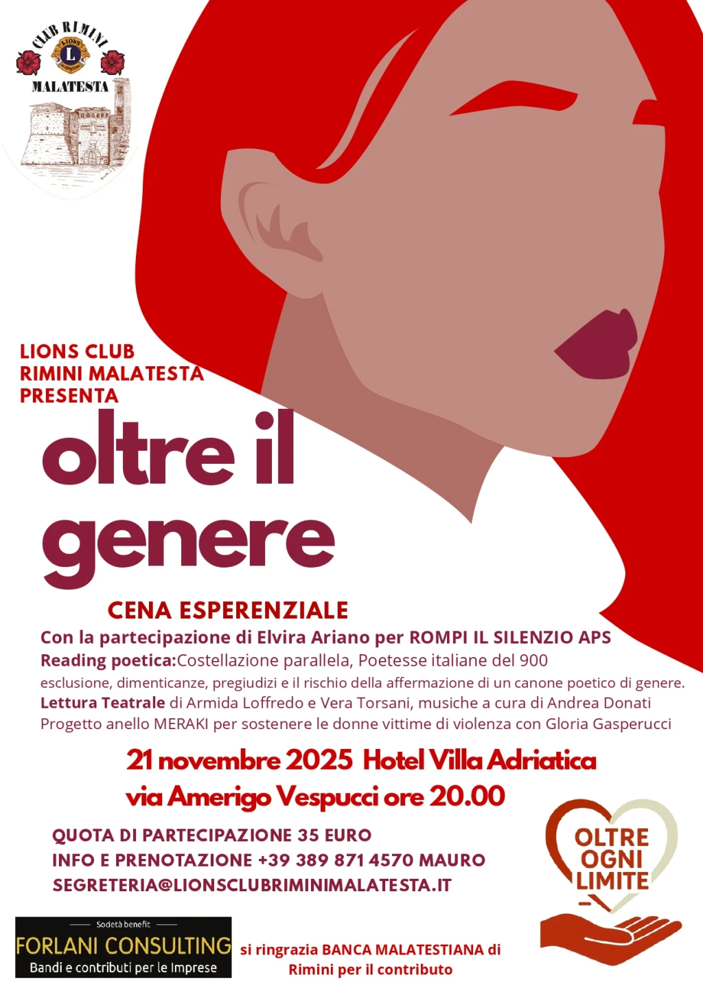 In occasione della Giornata Internazionale contro la Violenza sulle Donne, il Lions Club Rimini Malatesta promuove una cena evento dal titolo Oltre il genere, che si terrà giovedì 21 novembre 2025 alle ore 20.00 presso l’Hotel Villa Adriatica, in via Amerigo Vespucci a Rimini.