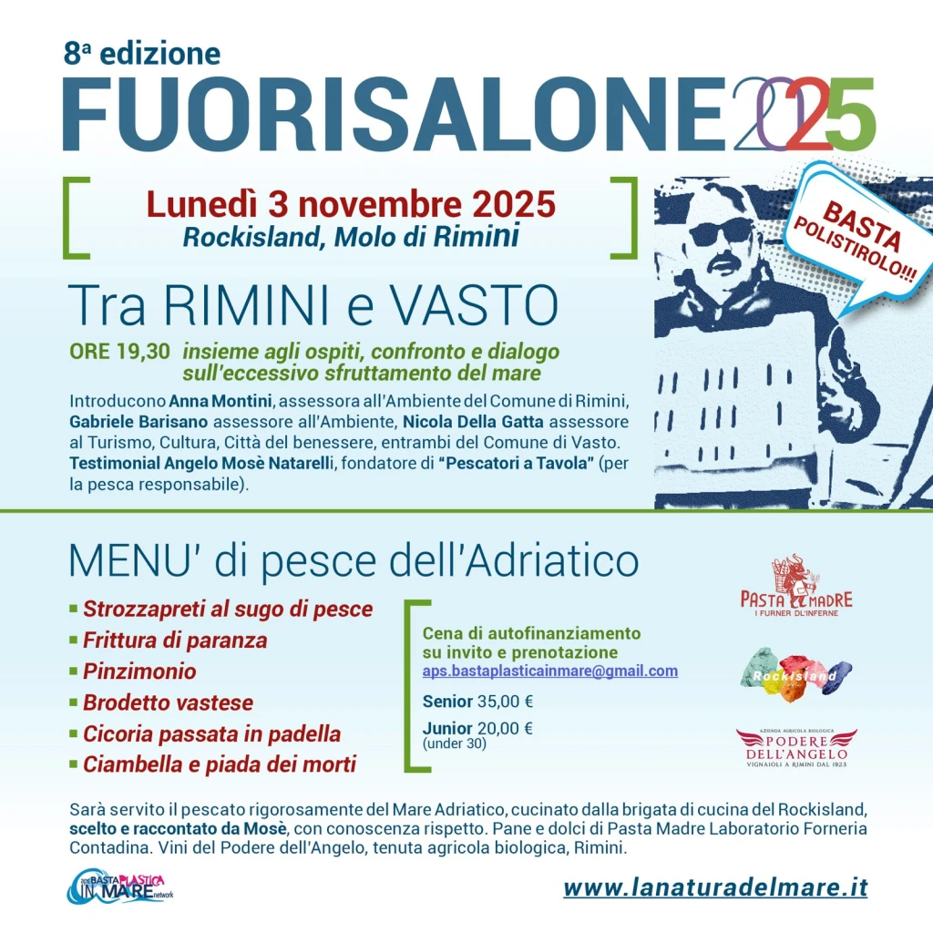 FUORISALONE 2025 è promosso da APS Basta Plastica in Mare Network, in collaborazione con ISDE (medici per l’Ambiente), MAREVIVO, Fondazione Piano Strategico, Comuni Virtuosi, A Buon Rendere, Spesa Sballata. Con il patrocinio di Regione Emilia-Romagna, Provincia di Rimini, Comune di Rimini e Comune di Vasto.