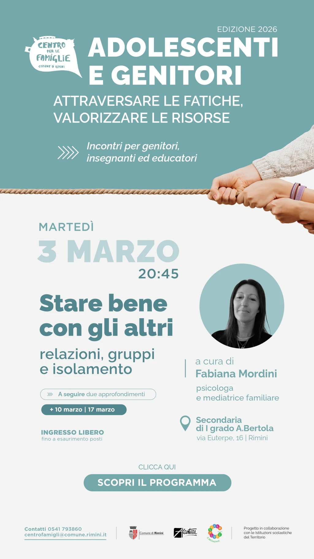 Prosegue il percorso “Adolescenti e genitori: attraversare le fatiche, valorizzare le risorse”, promosso dal Centro per le Famiglie del Comune di Rimini, in collaborazione con gli Istituti Comprensivi del territorio e l’Associazione Teatrale Alcantara.