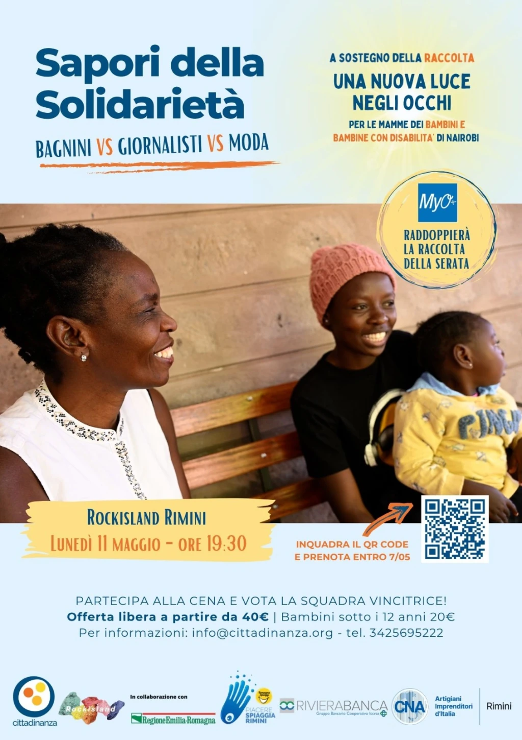 L’iniziativa si svolge con il sostegno del ristorante Rockisland e di altre realtà del territorio: il consorzio Piacere Spiaggia Rimini, CNA Rimini, Rivierabanca, Trattoria La Marianna e Bar Pasticceria Vecchi, che insieme a Cittadinanza, rendono possibile una serata in cui il piacere di stare insieme diventa anche supporto reale per tante famiglie di Nairobi.