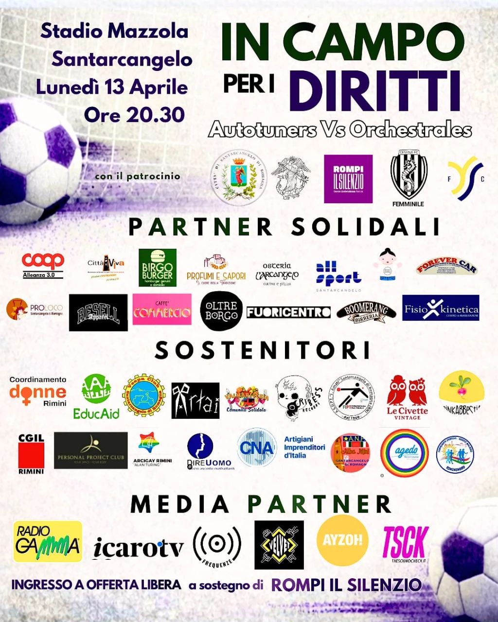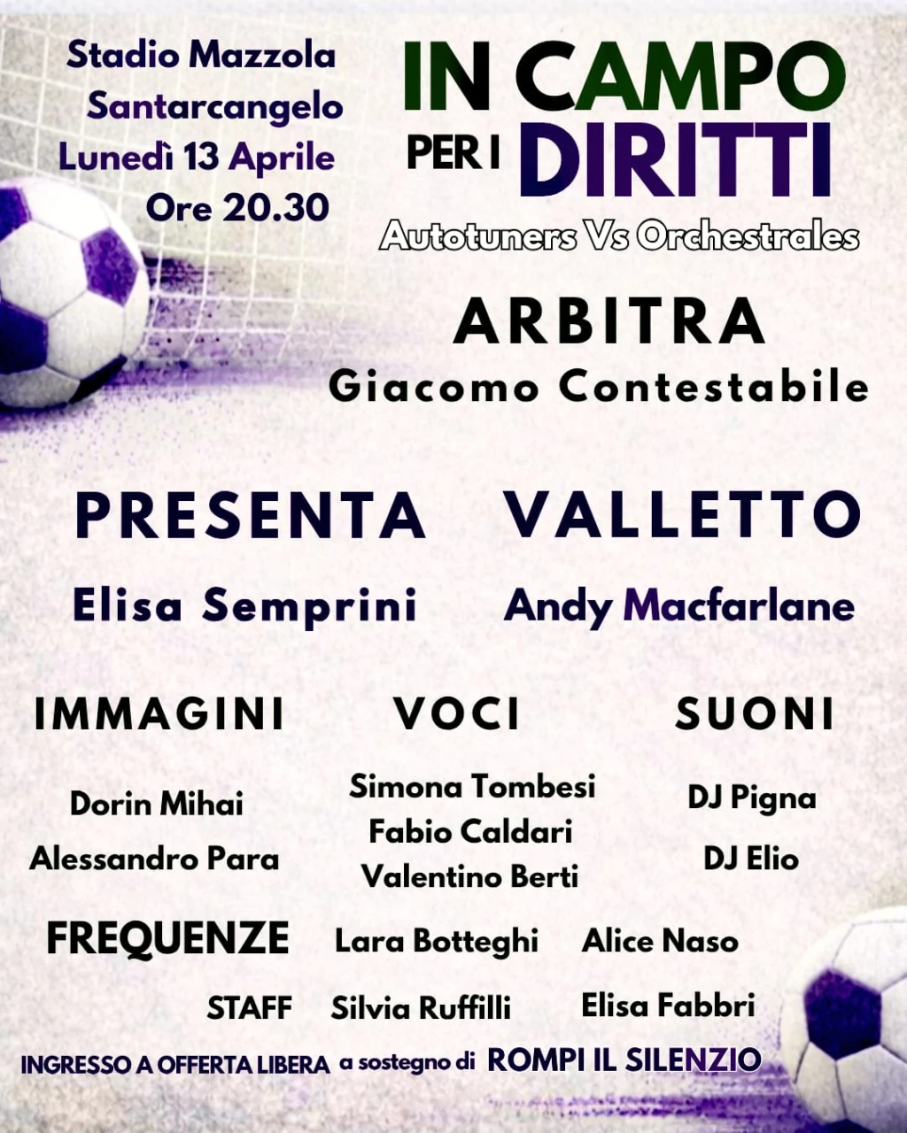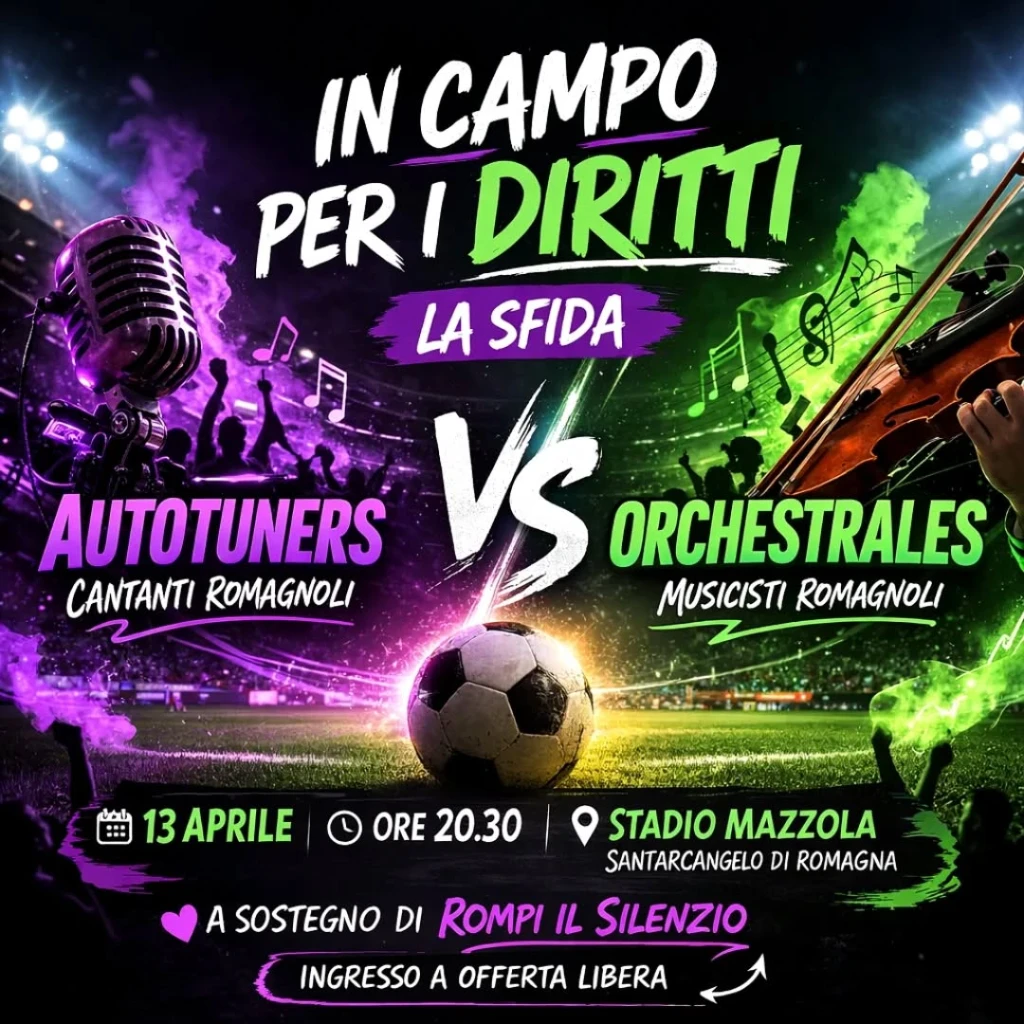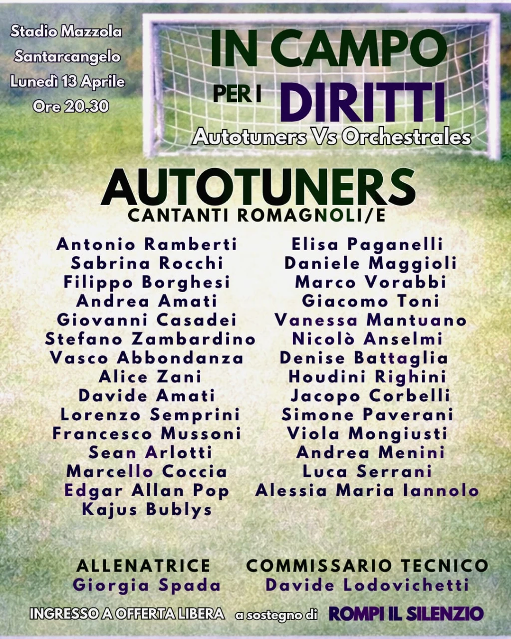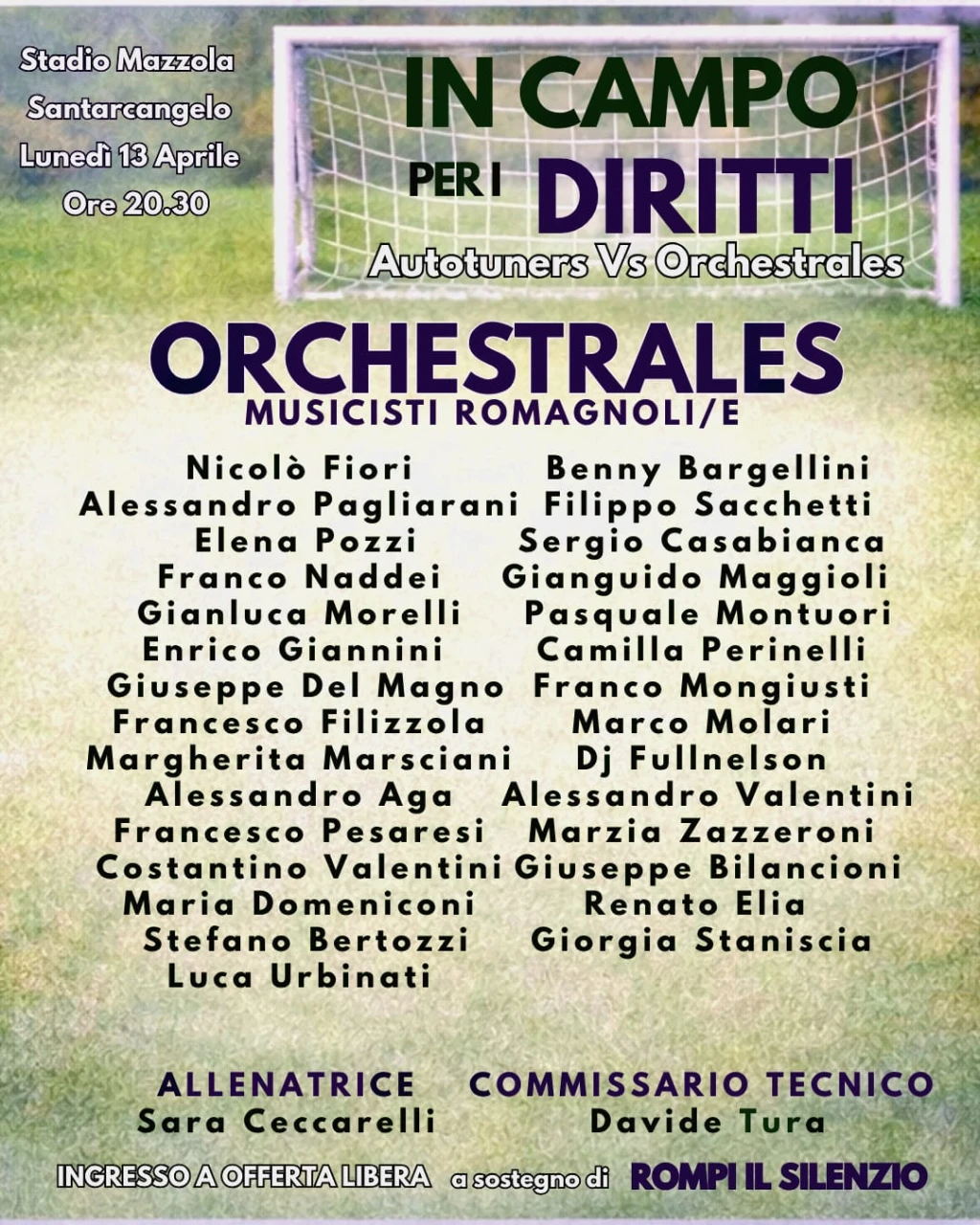 Dopo la prima partita che ha visto fronteggiarsi Autotuners e Orchestrales allo stadio Mazzola di Santarcangelo, il mondo della musica e della solidarietà romagnolo torna in campo il prossimo lunedì 13 aprile.
